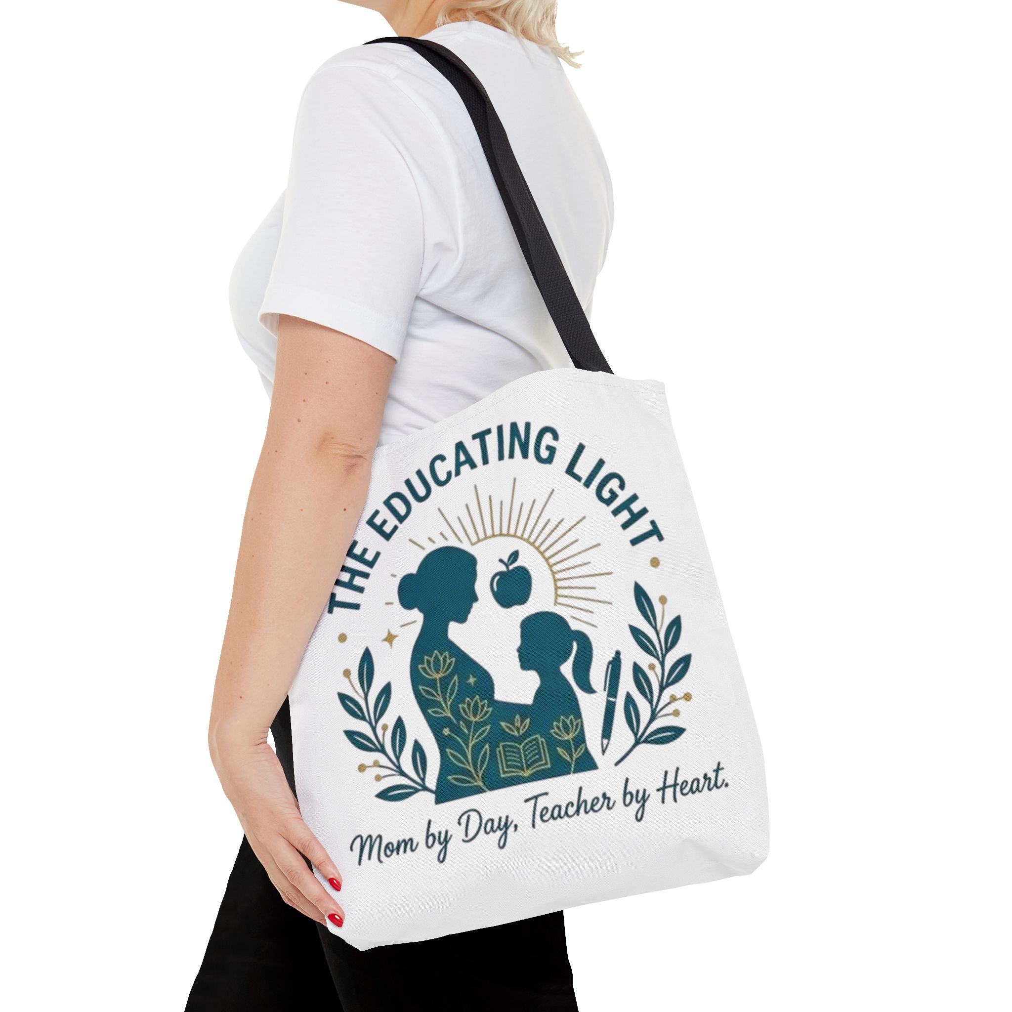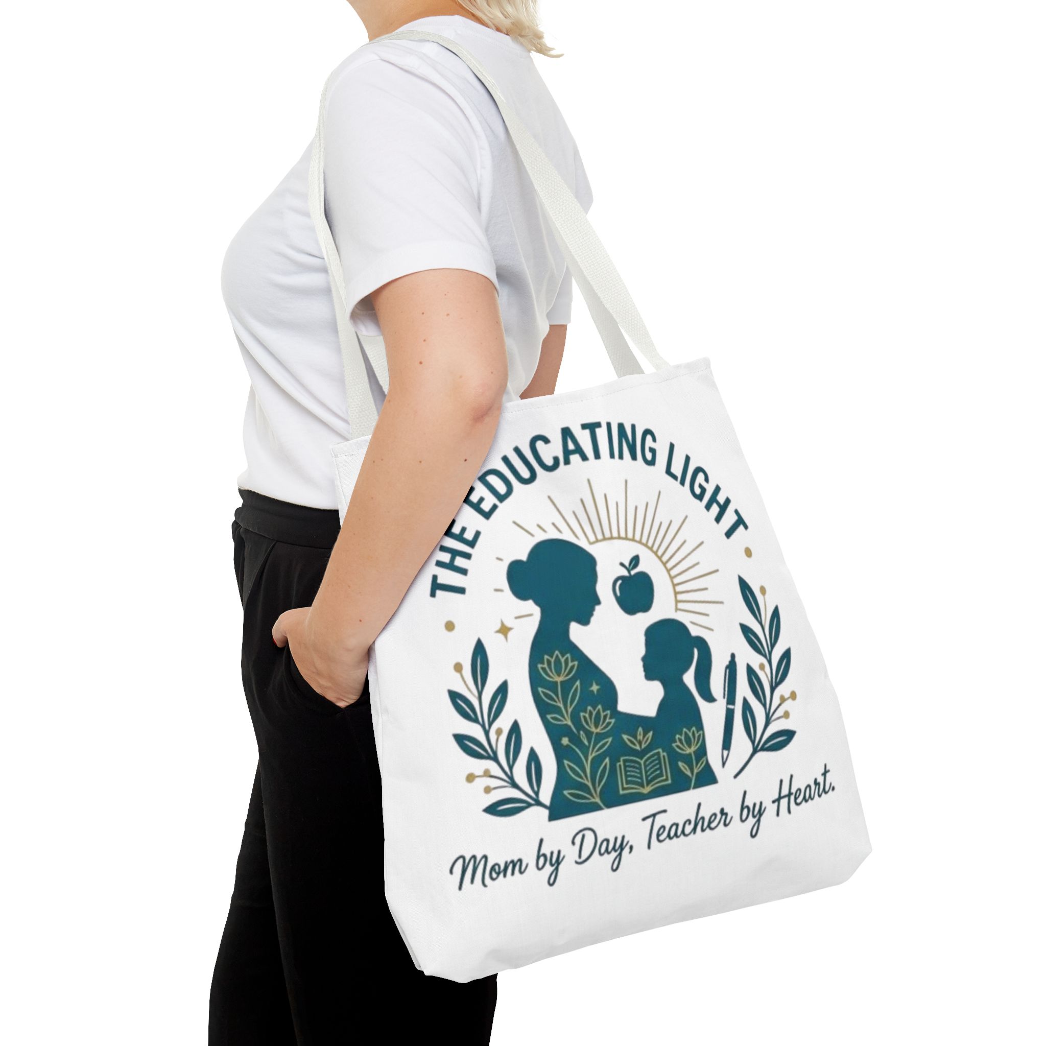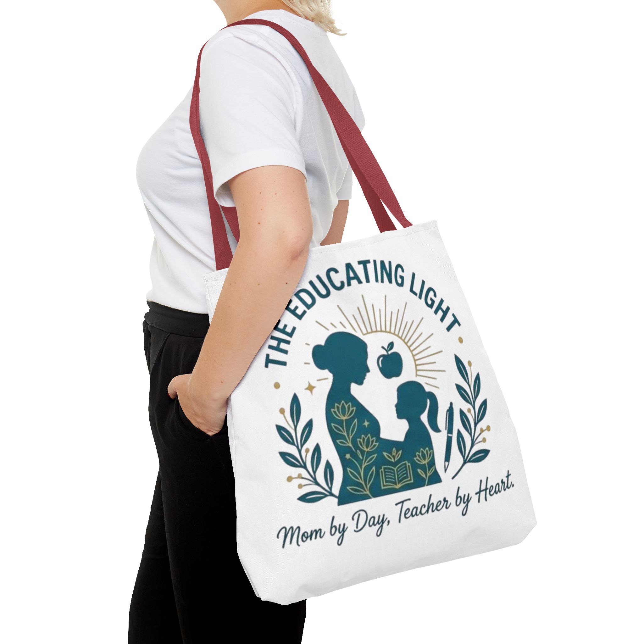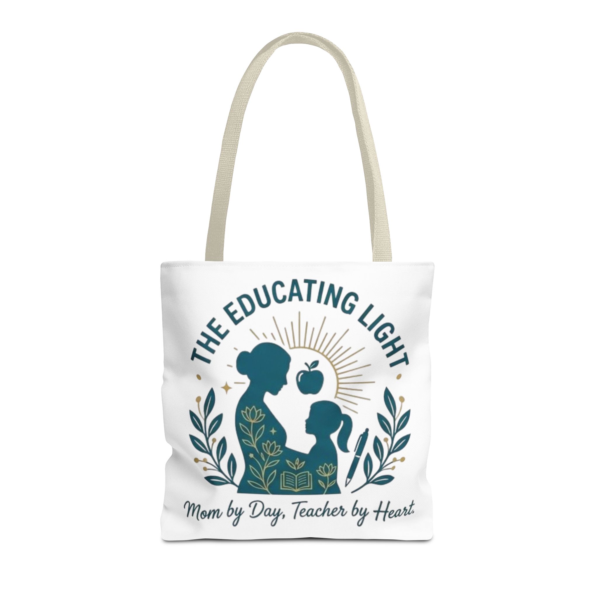 Carry a little daily pride with this roomy, durable tote designed for teachers who nurture both at home and in the classroom. The soft white body showcases a warm, illustrative crest: a parent and child silhouette framed by laurel leaves, an apple, and gentle rays—captioned “The Educating Light” and “Mom by Day, Teacher by Heart.” It reads like a quiet badge of service, slipping easily over a shoulder to hold lesson plans, library books, snacks, or the small essentials of a busy day. The medium-weight polyester holds shape and resists wrinkles, while boxed corners add useful volume. Choose a handle color to match your style, and enjoy reinforced stitching that stands up to constant use. This tote feels familiar—like the calm after school pick-up, the hush before story time, and the steady rhythm of teaching and parenting woven into one.