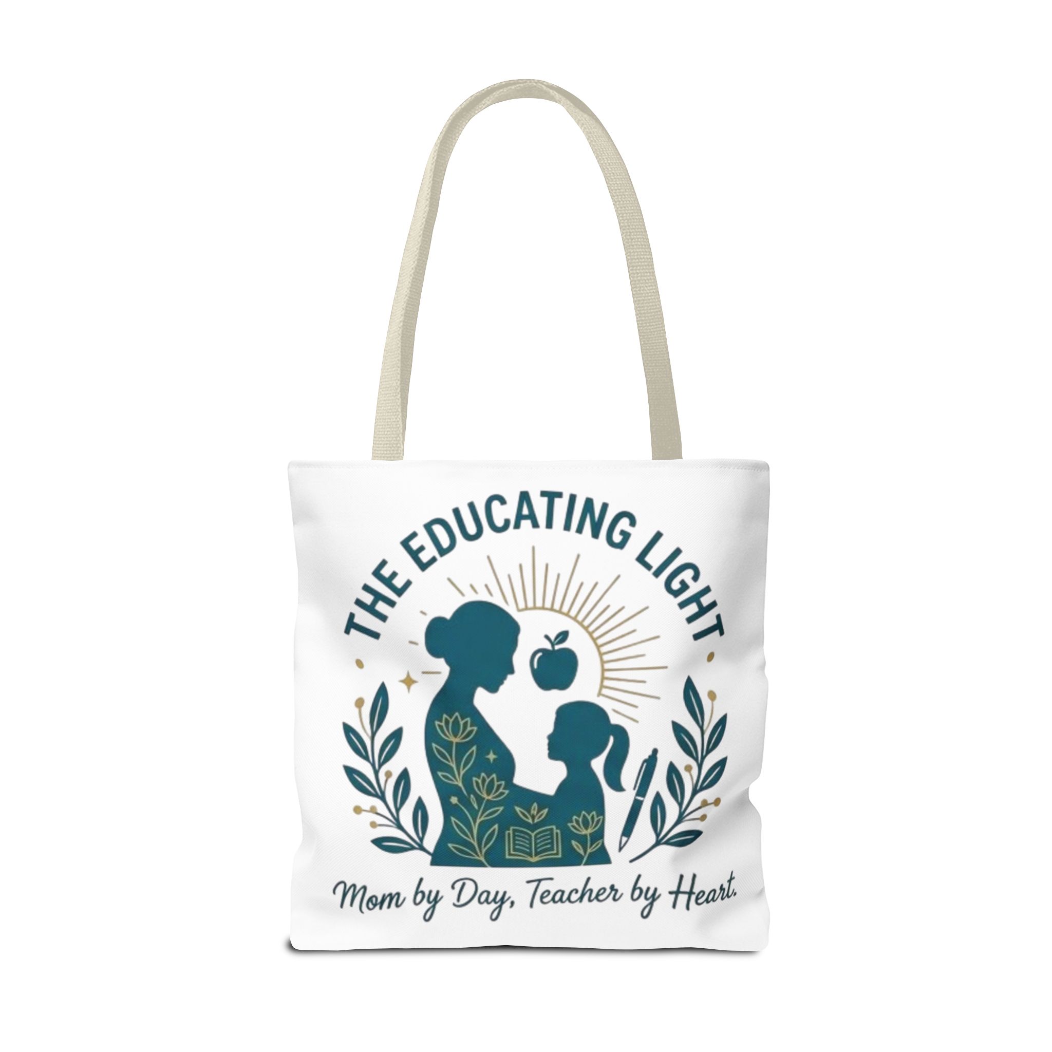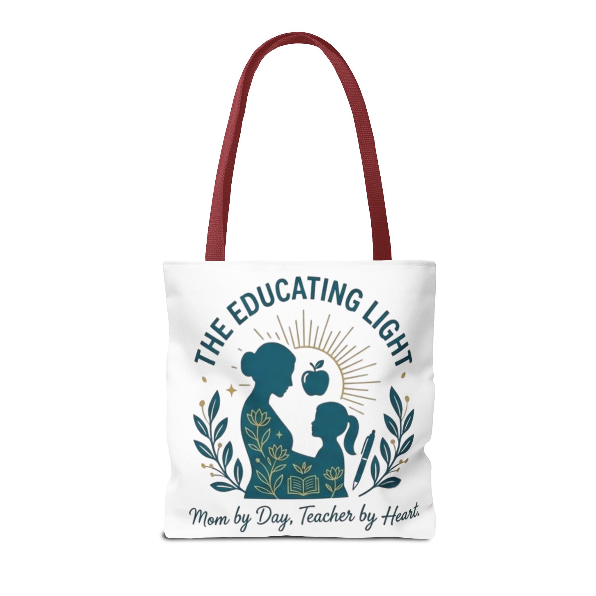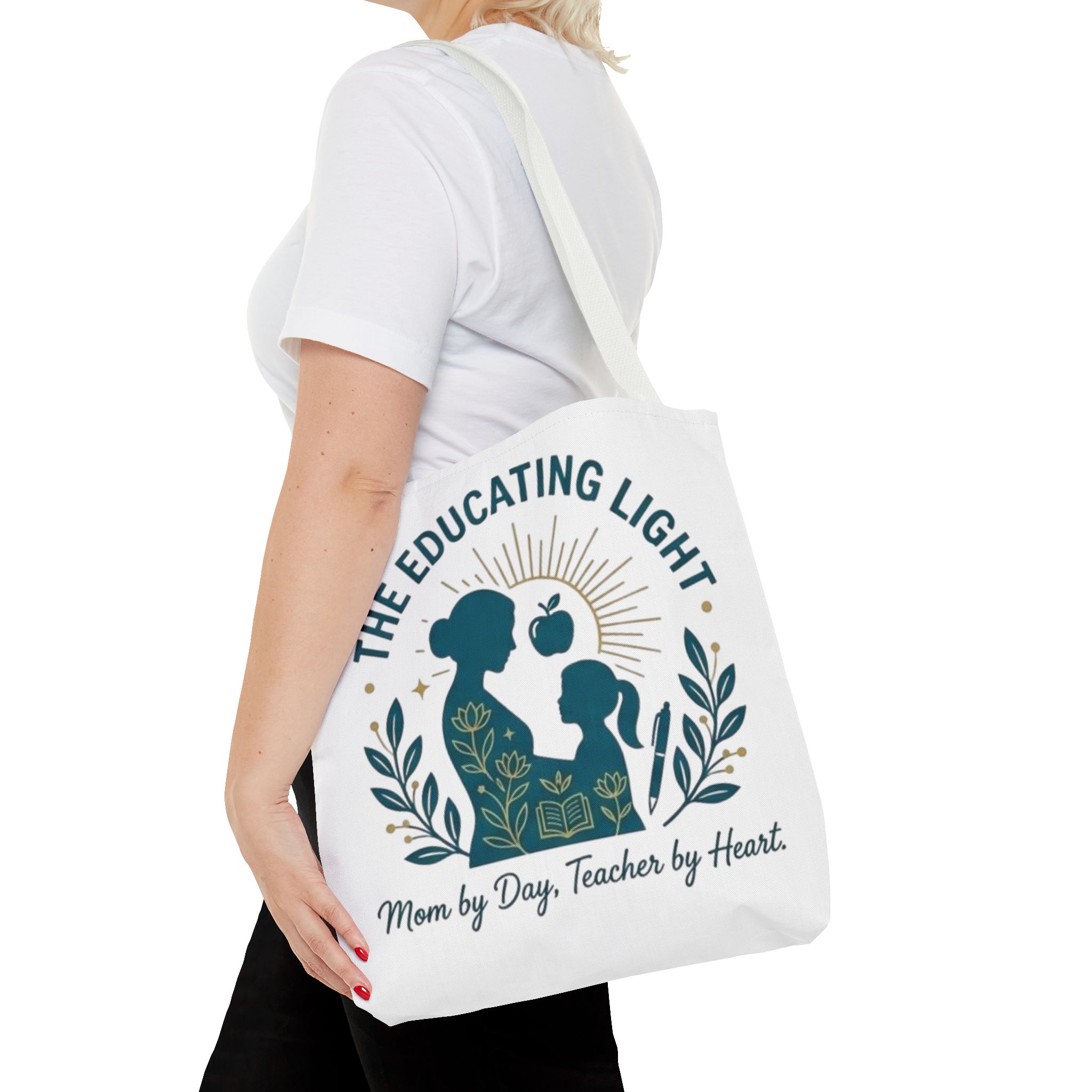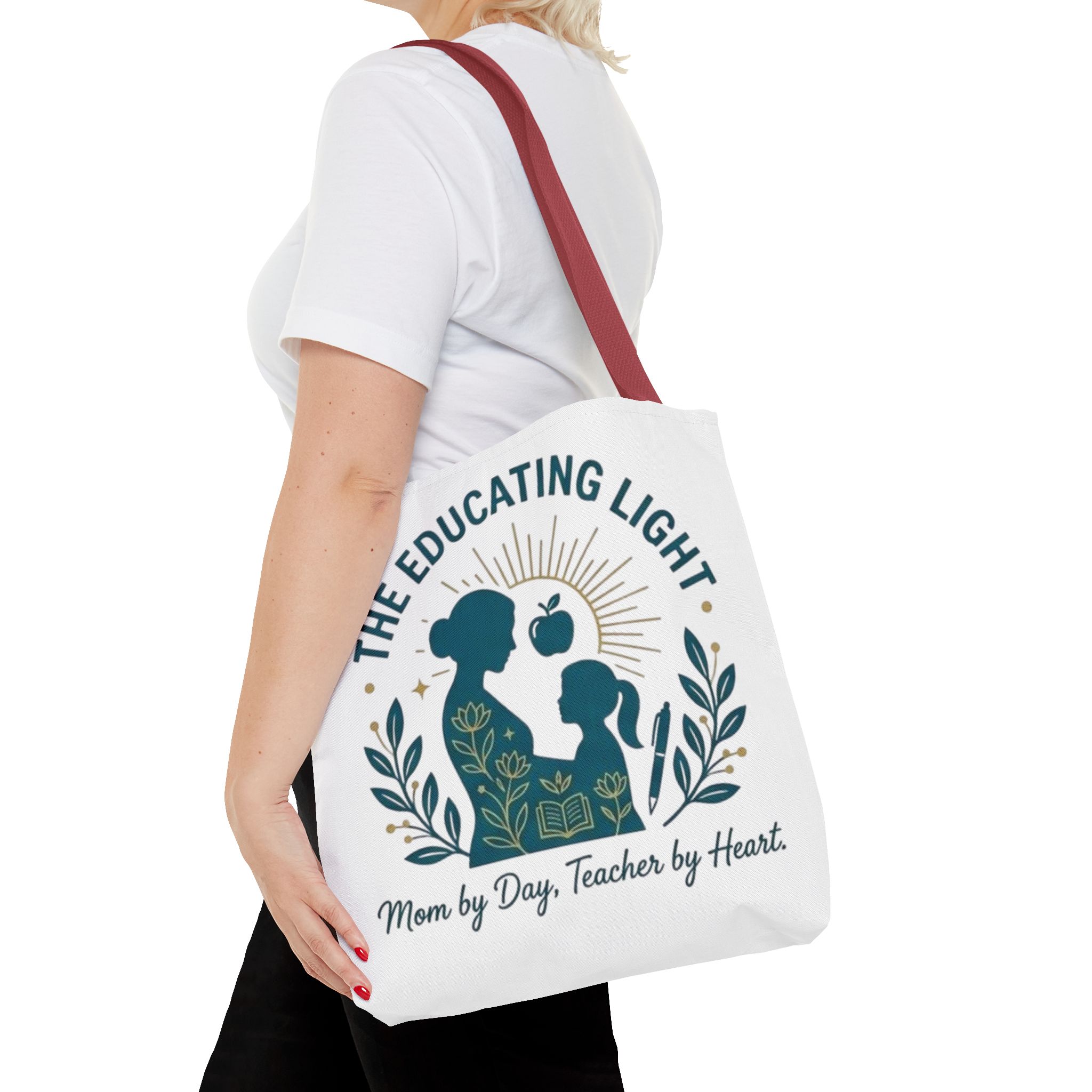 Carry a little daily pride with this roomy, durable tote designed for teachers who nurture both at home and in the classroom. The soft white body showcases a warm, illustrative crest: a parent and child silhouette framed by laurel leaves, an apple, and gentle rays—captioned “The Educating Light” and “Mom by Day, Teacher by Heart.” It reads like a quiet badge of service, slipping easily over a shoulder to hold lesson plans, library books, snacks, or the small essentials of a busy day. The medium-weight polyester holds shape and resists wrinkles, while boxed corners add useful volume. Choose a handle color to match your style, and enjoy reinforced stitching that stands up to constant use. This tote feels familiar—like the calm after school pick-up, the hush before story time, and the steady rhythm of teaching and parenting woven into one.