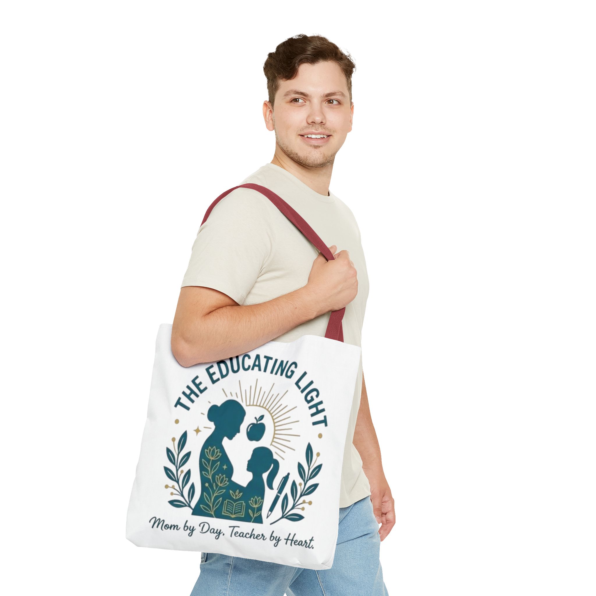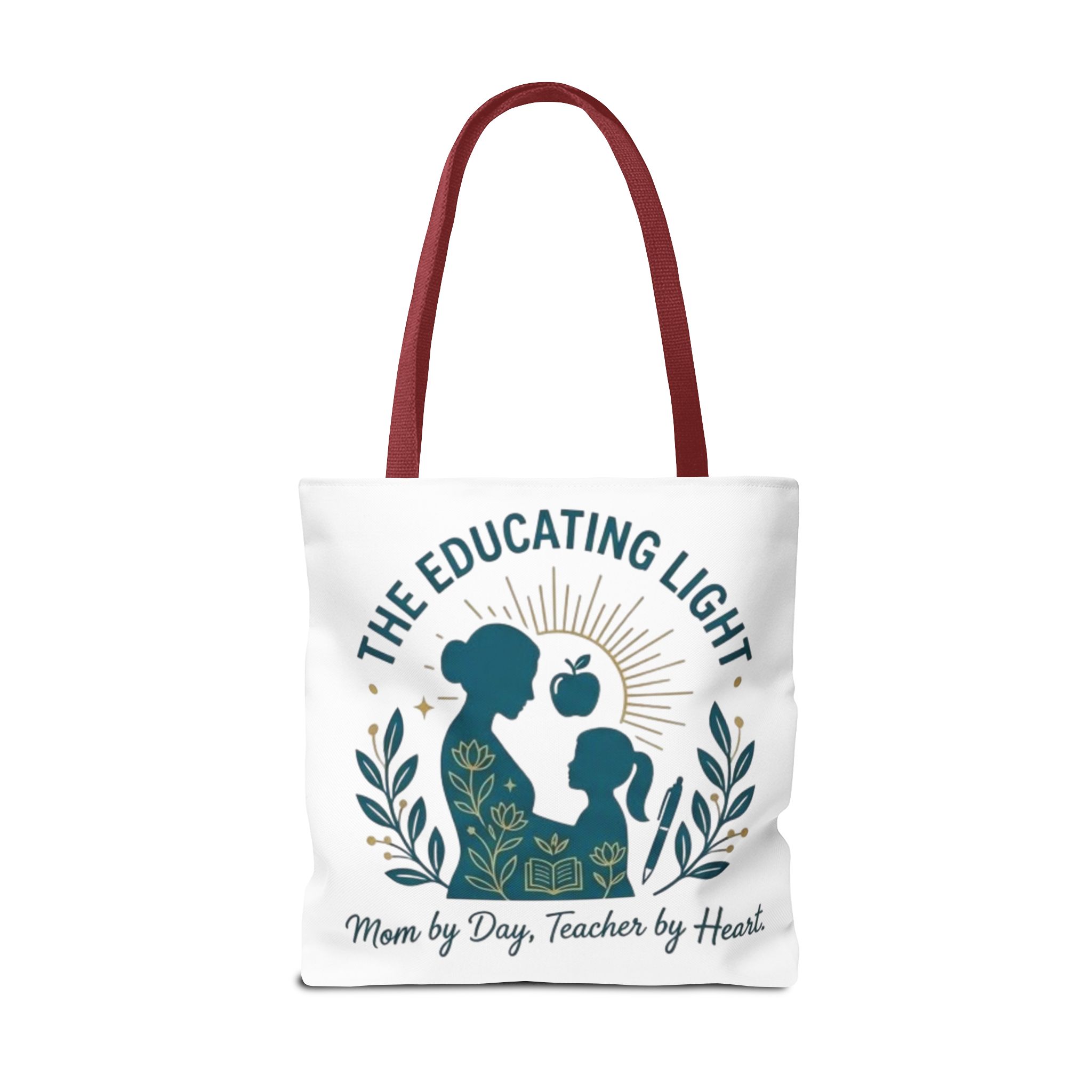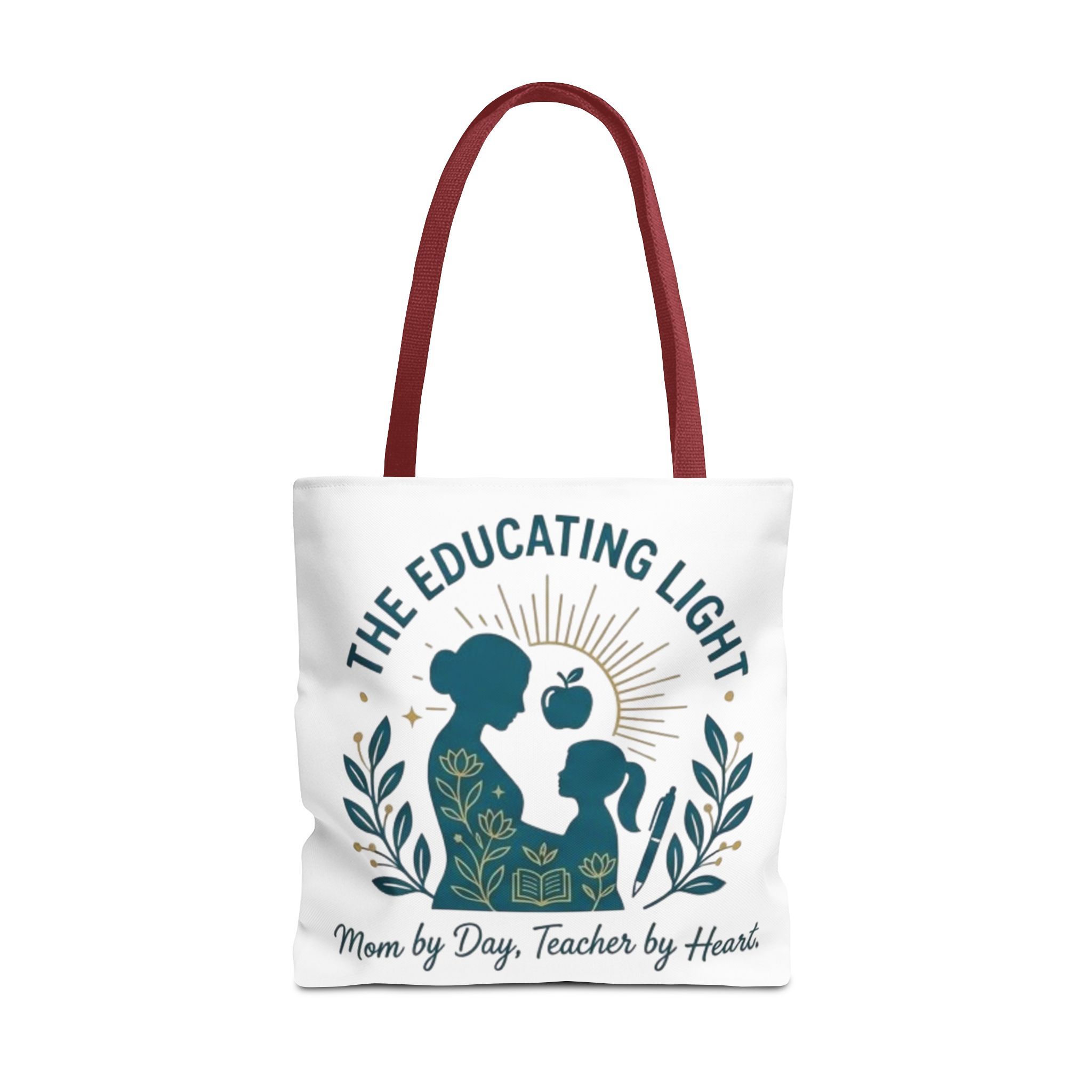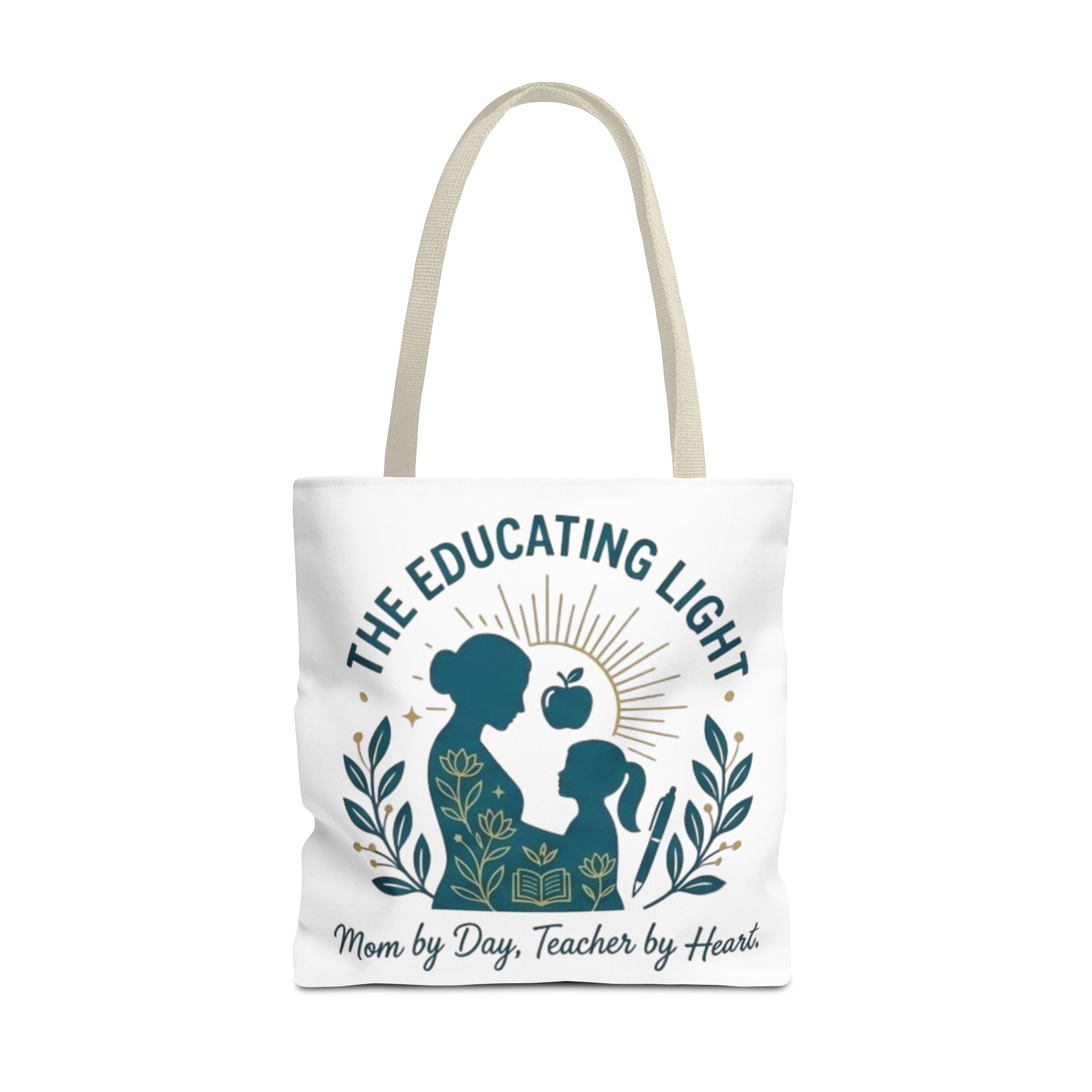 Carry a little daily pride with this roomy, durable tote designed for teachers who nurture both at home and in the classroom. The soft white body showcases a warm, illustrative crest: a parent and child silhouette framed by laurel leaves, an apple, and gentle rays—captioned “The Educating Light” and “Mom by Day, Teacher by Heart.” It reads like a quiet badge of service, slipping easily over a shoulder to hold lesson plans, library books, snacks, or the small essentials of a busy day. The medium-weight polyester holds shape and resists wrinkles, while boxed corners add useful volume. Choose a handle color to match your style, and enjoy reinforced stitching that stands up to constant use. This tote feels familiar—like the calm after school pick-up, the hush before story time, and the steady rhythm of teaching and parenting woven into one.