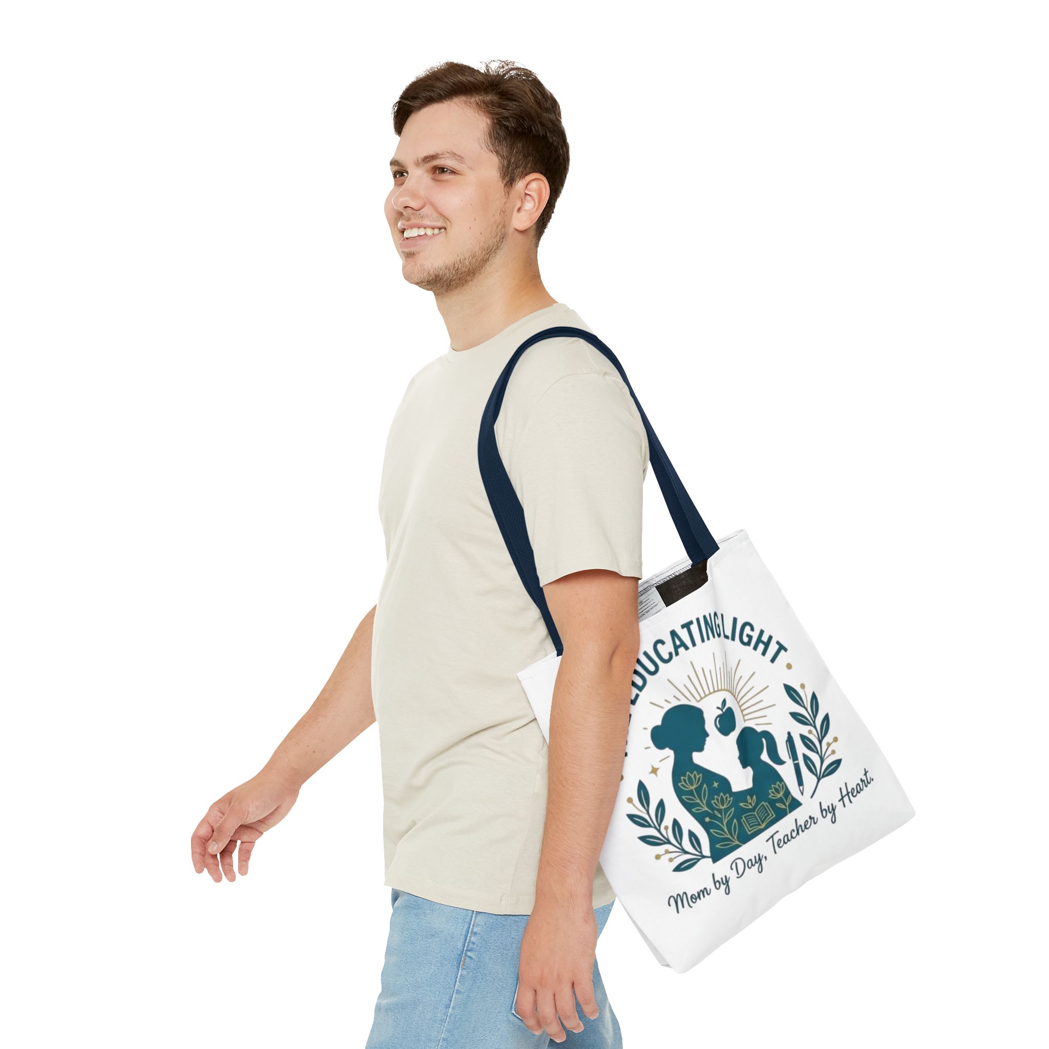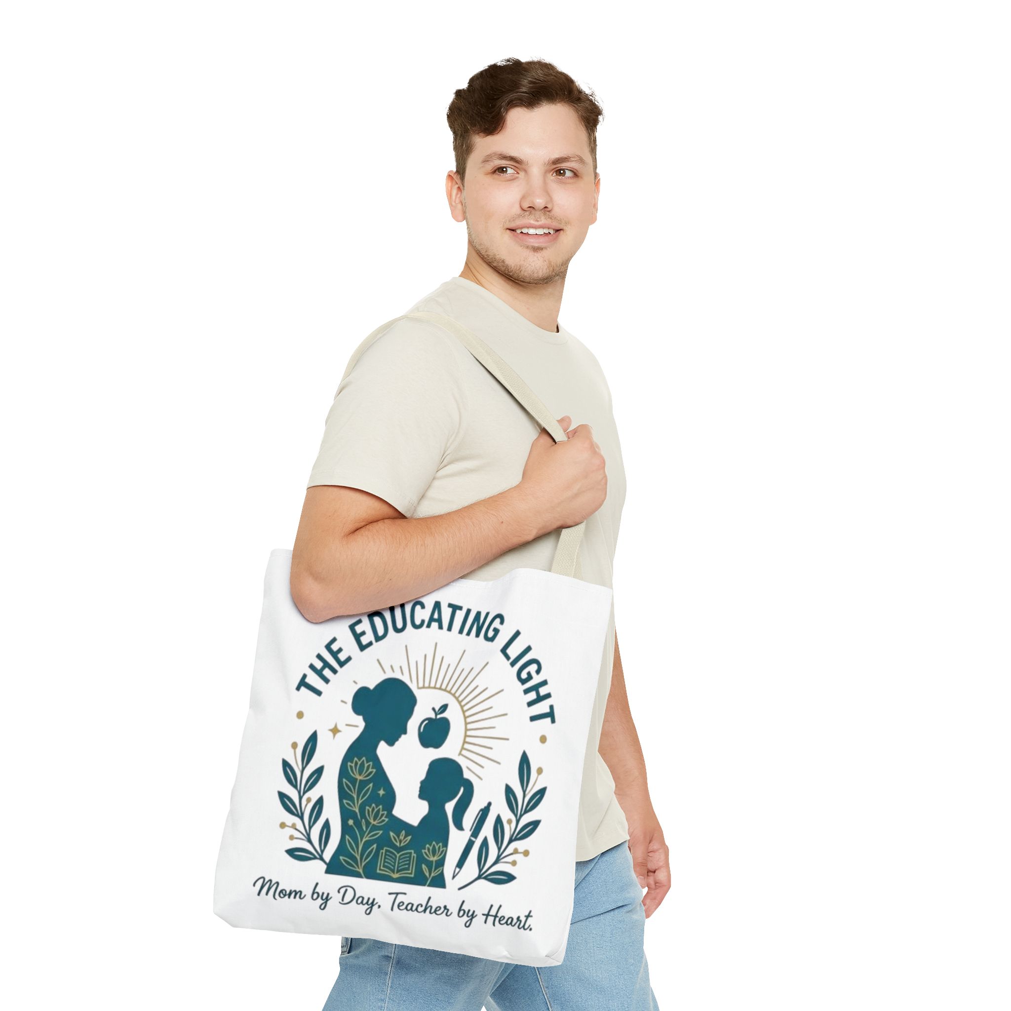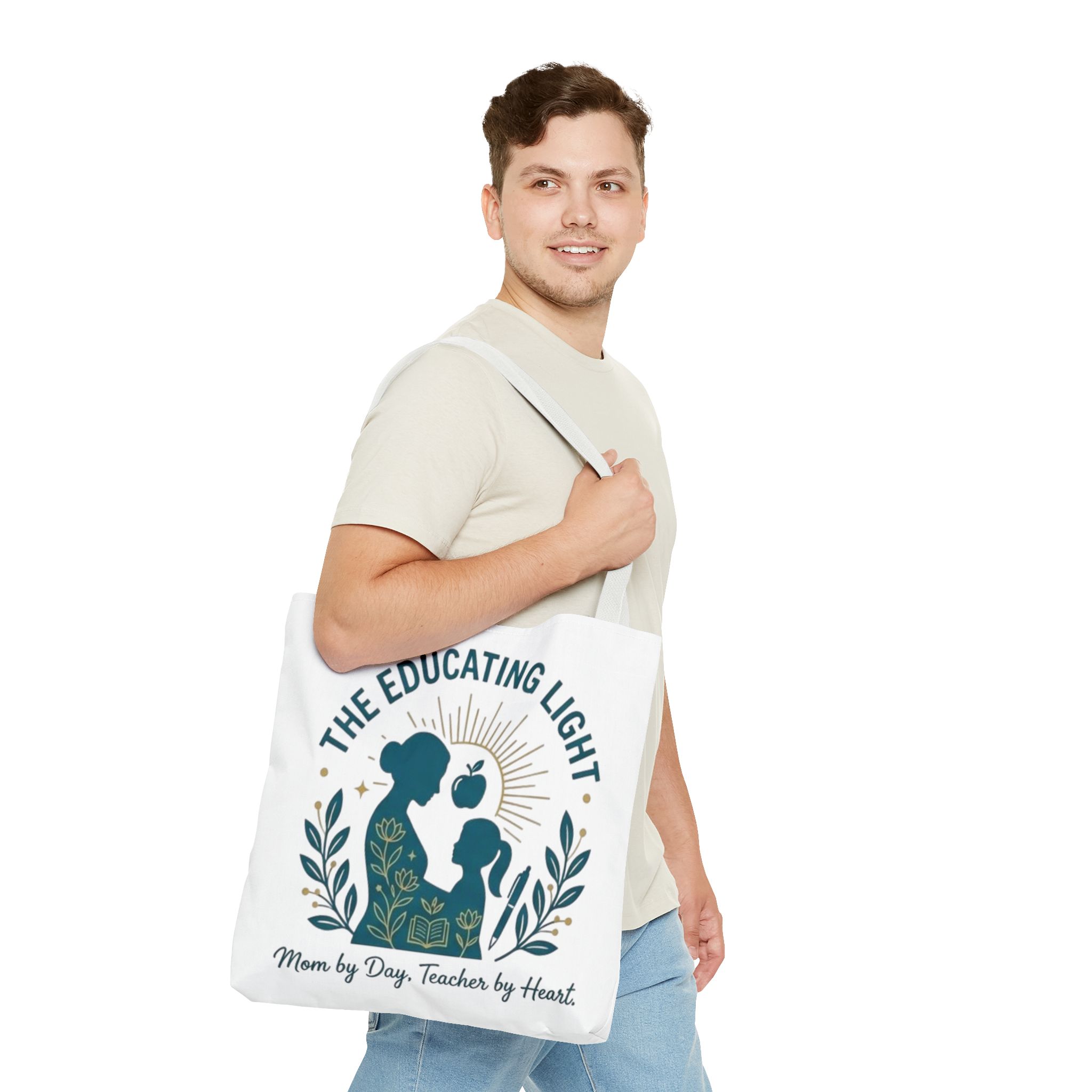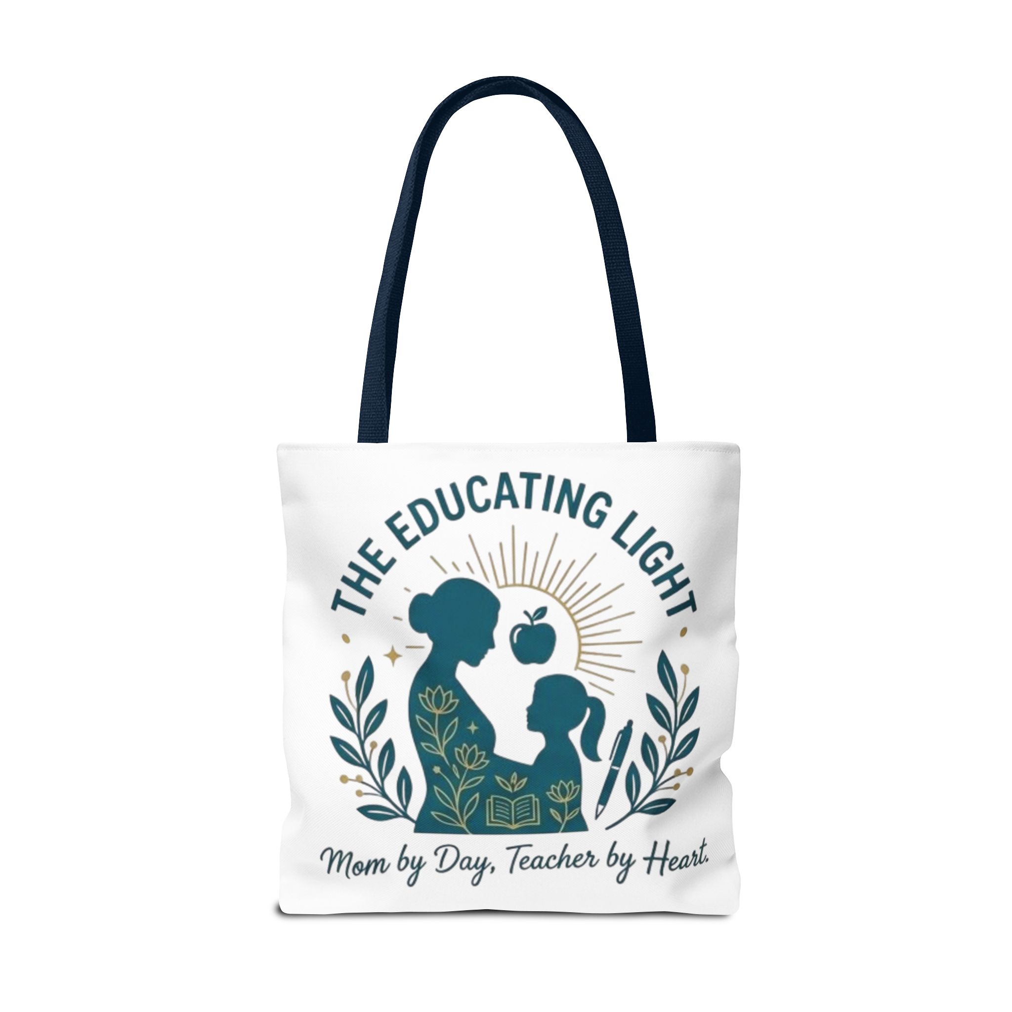 Carry a little daily pride with this roomy, durable tote designed for teachers who nurture both at home and in the classroom. The soft white body showcases a warm, illustrative crest: a parent and child silhouette framed by laurel leaves, an apple, and gentle rays—captioned “The Educating Light” and “Mom by Day, Teacher by Heart.” It reads like a quiet badge of service, slipping easily over a shoulder to hold lesson plans, library books, snacks, or the small essentials of a busy day. The medium-weight polyester holds shape and resists wrinkles, while boxed corners add useful volume. Choose a handle color to match your style, and enjoy reinforced stitching that stands up to constant use. This tote feels familiar—like the calm after school pick-up, the hush before story time, and the steady rhythm of teaching and parenting woven into one.