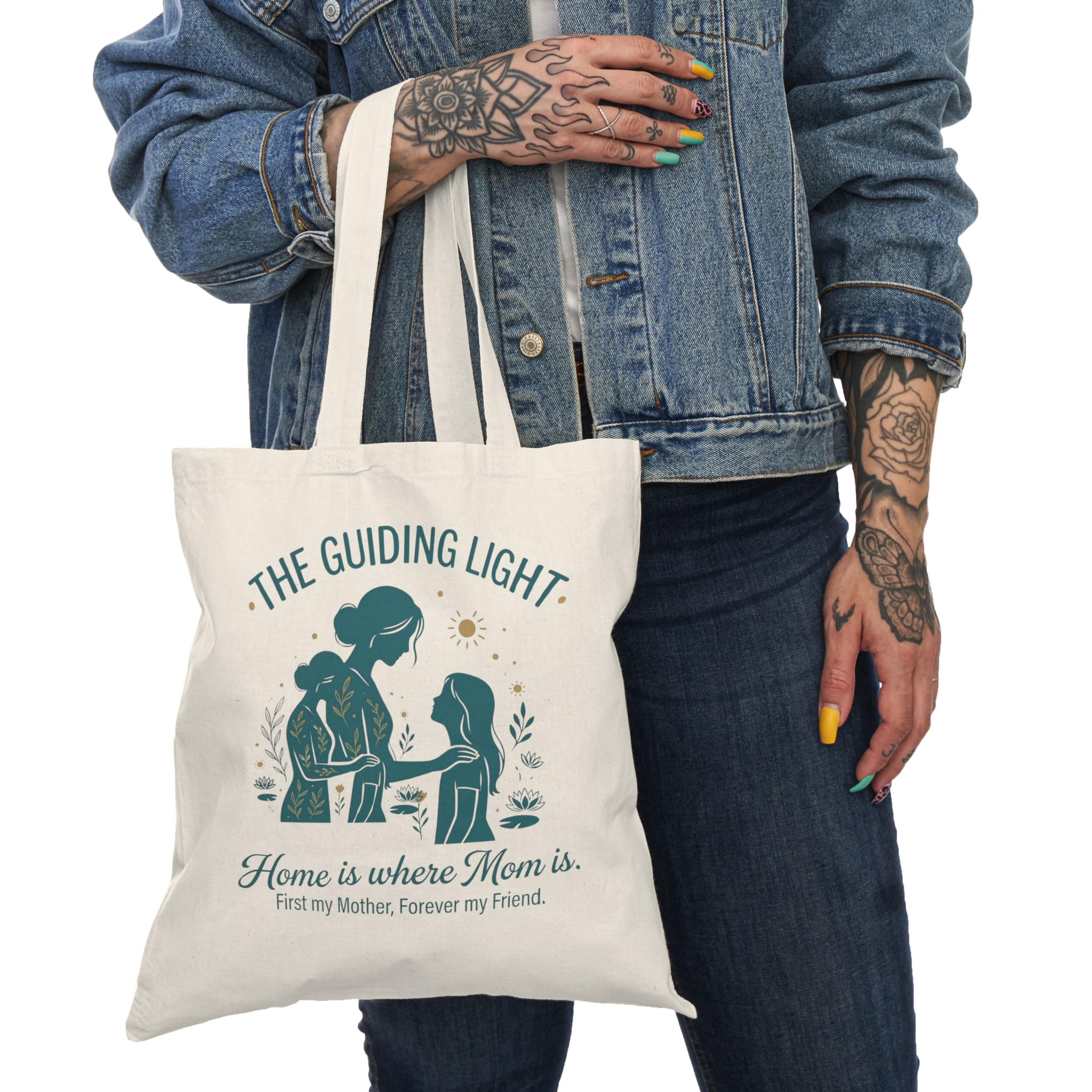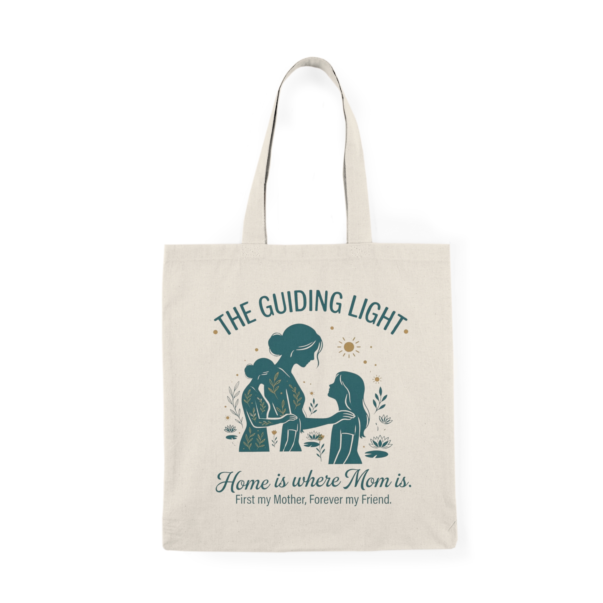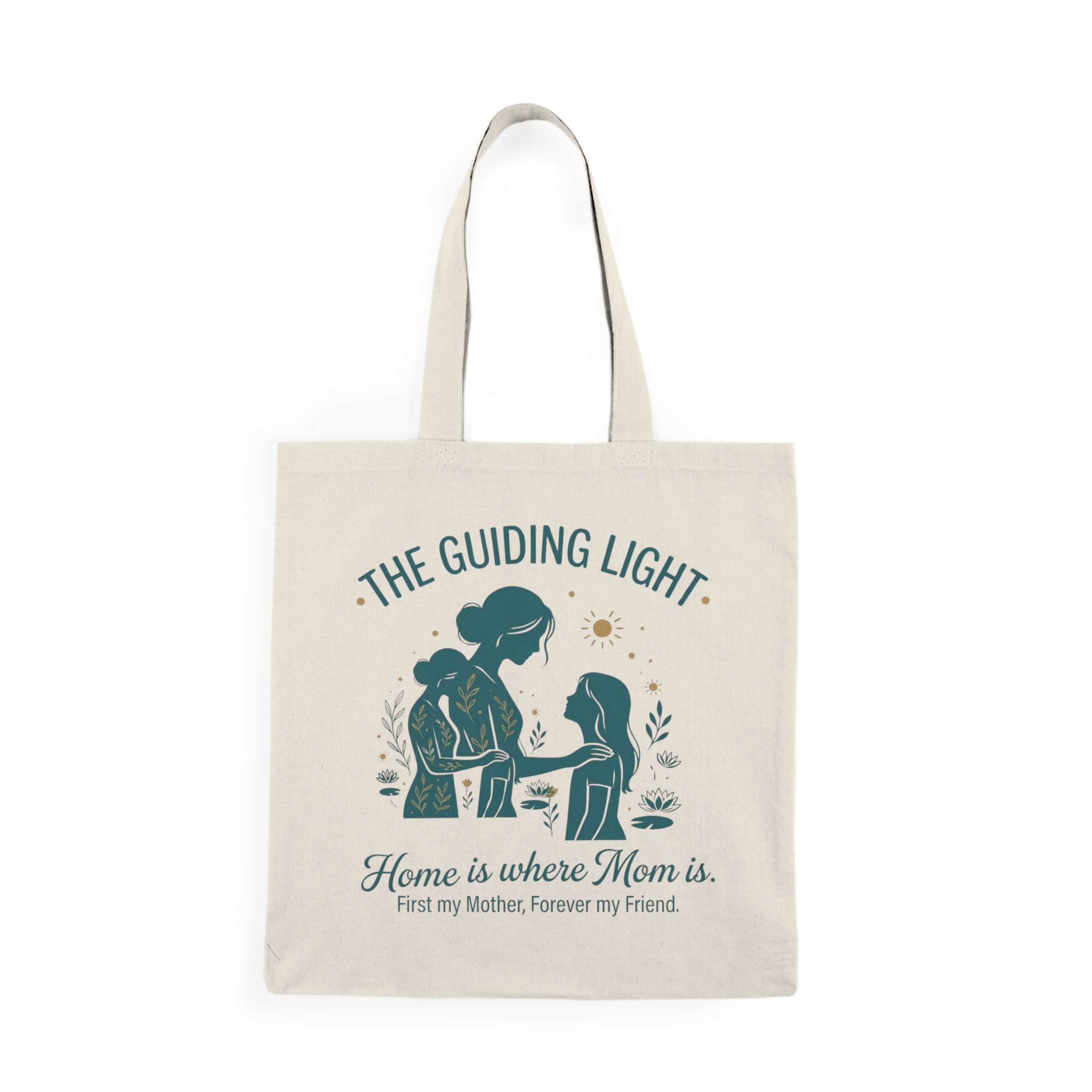 A warm, everyday canvas tote that carries more than groceries — it carries a moment. The soft natural cotton shows off a calming illustrated scene of a mother and child beneath the words “The Guiding Light,” with the tender line “Home is where Mom is. First my Mother, Forever my Friend.” The design feels like a quiet morning walk, a hand held tight, and a steady presence. Use it for library runs, farmers’ markets, school drop-offs, or as a thoughtful companion on visits. The neutral canvas and muted, jewel-toned print blend with casual wardrobes and cozy, home-forward lifestyles, making this tote feel familiar the instant you pick it up.