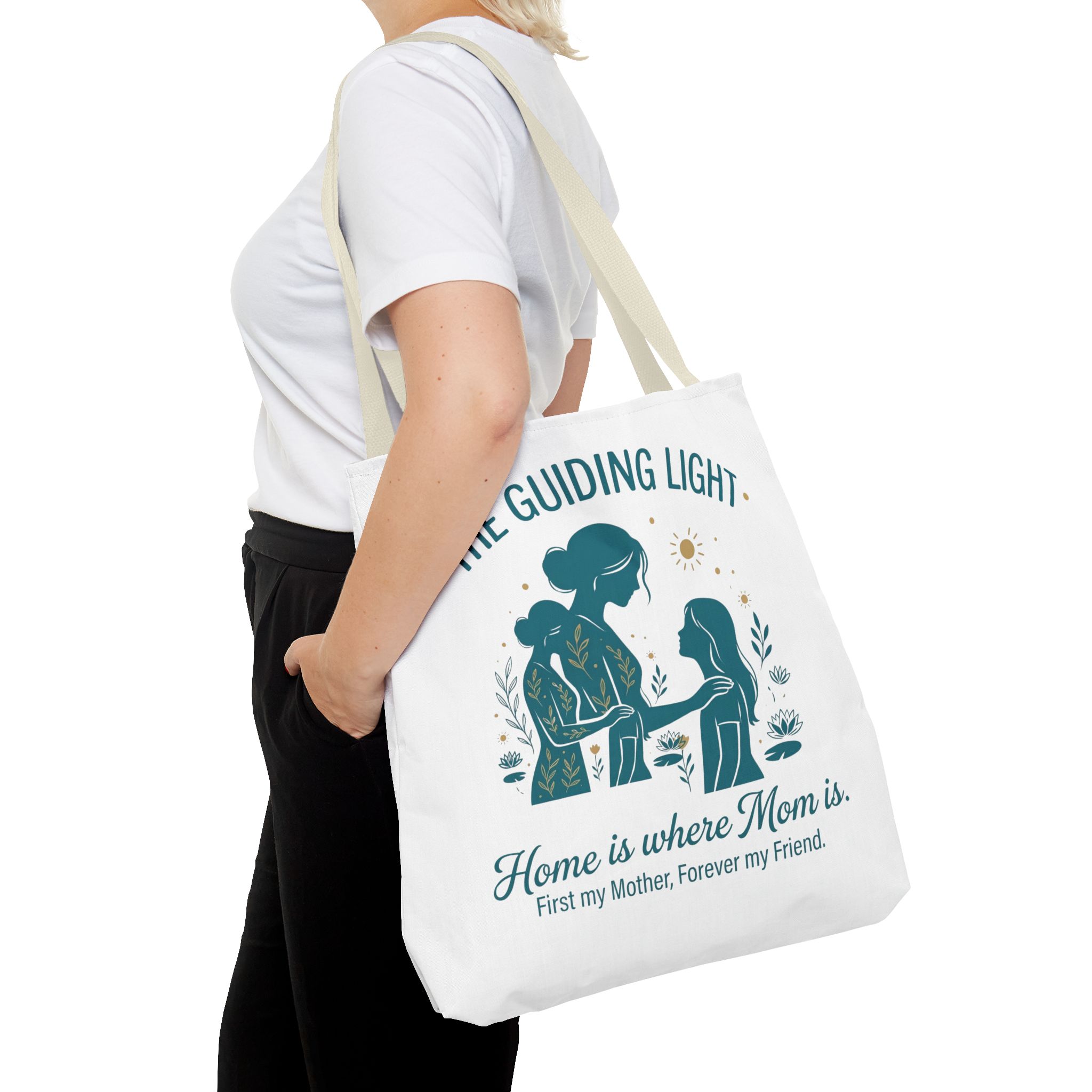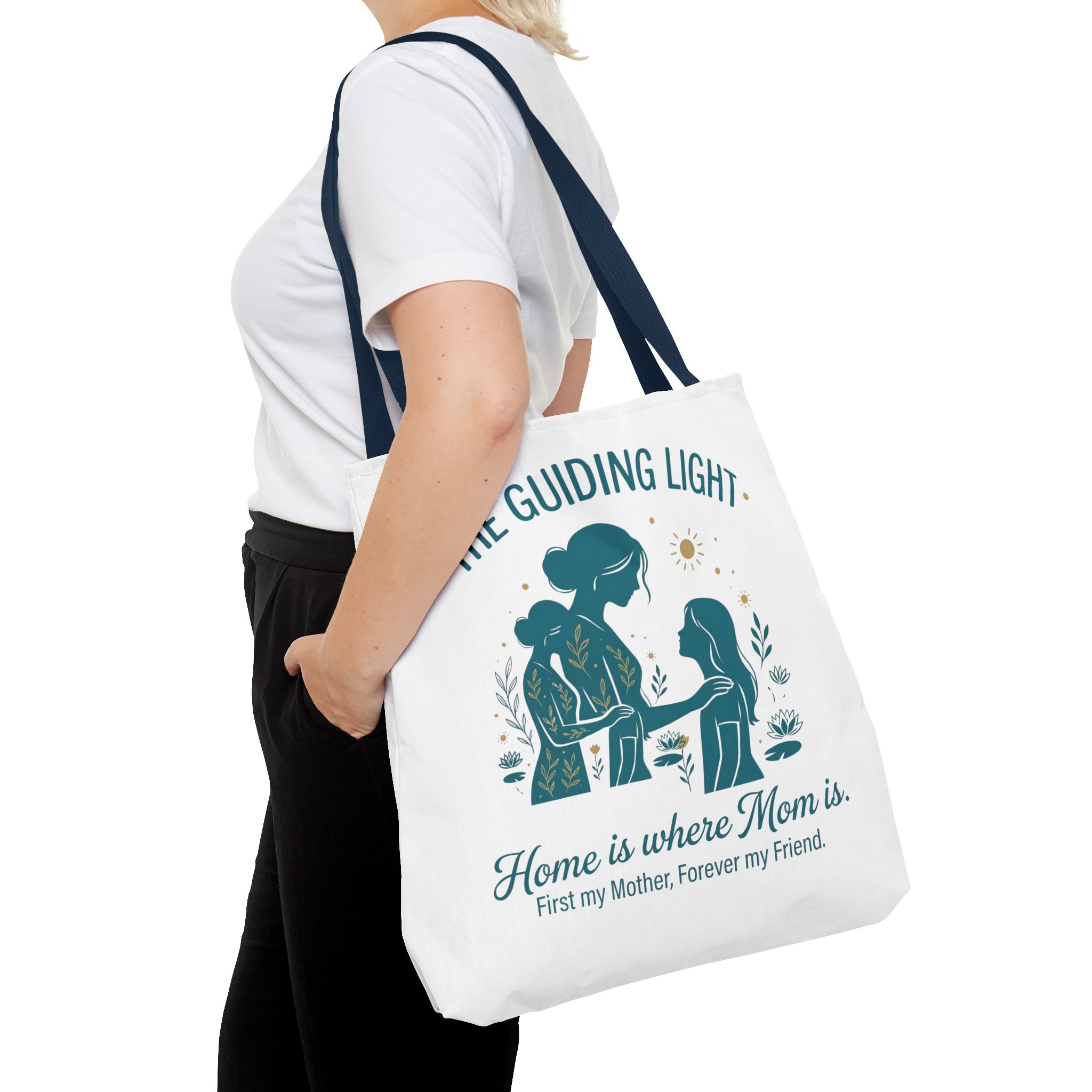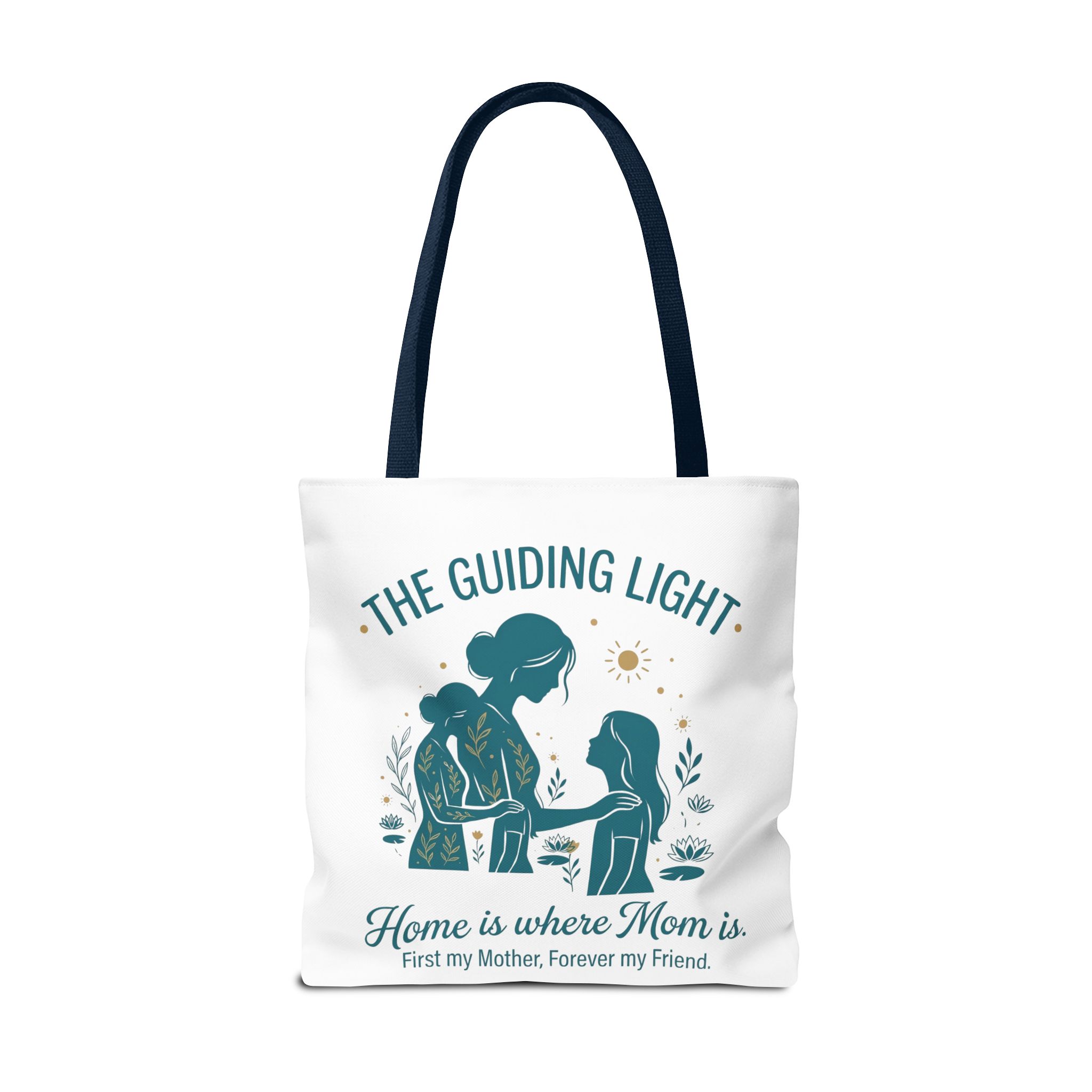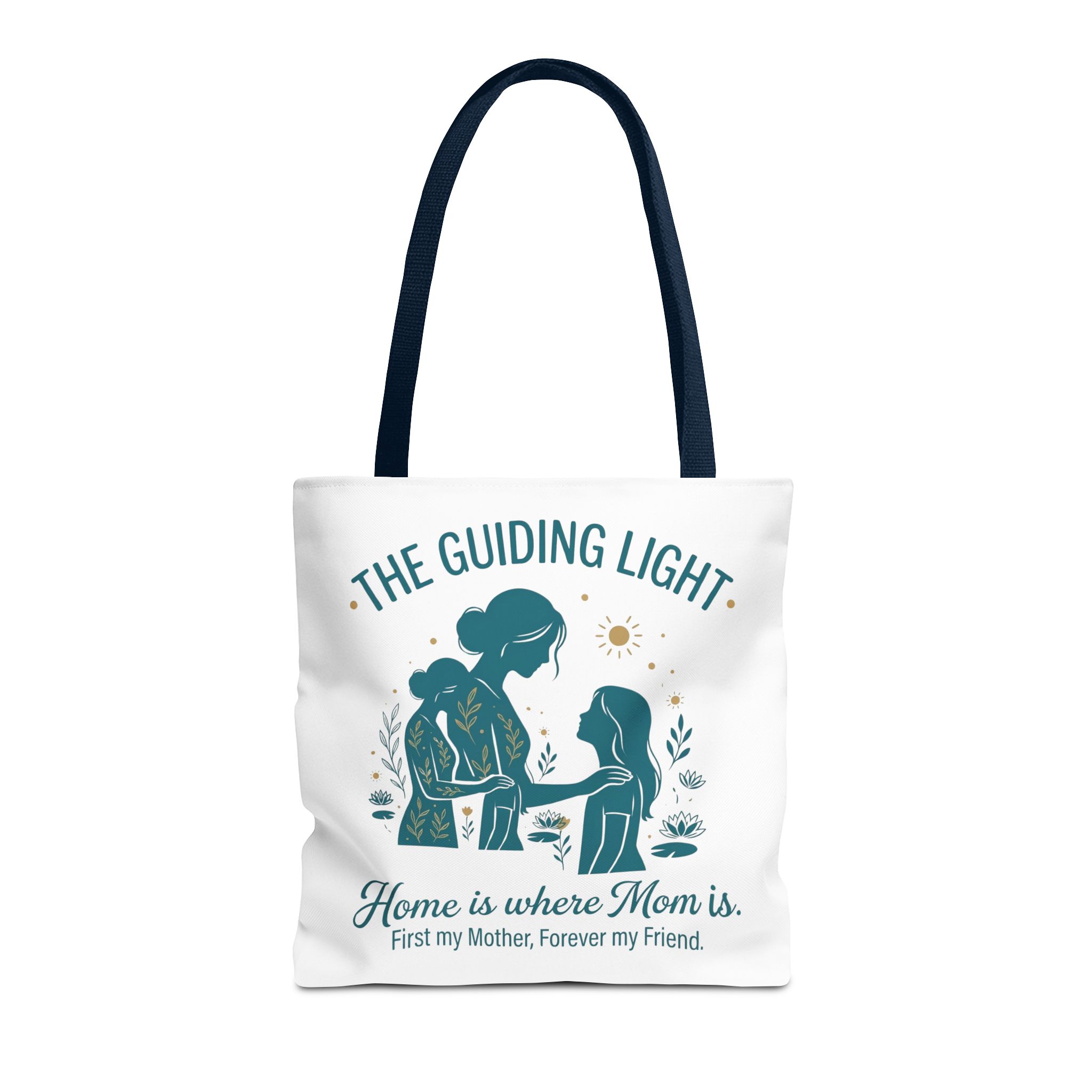 A soft, everyday tote that carries more than just groceries. The simple illustrated scene shows a mother and child sharing a quiet moment—warm teal tones, gentle sun and botanical accents—above the heartfelt line: “Home is where Mom is. First my Mother, Forever my Friend.” Lightweight yet sturdy 100% polyester holds shape and dries fast, while boxed corners add real capacity for books, market finds, or weekend essentials. Choose a handle color that matches your style; the reinforced stitching and non-woven laminate interior keep the bag looking neat through repeated use. This tote slips into daily life easily: school runs, library visits, picnics, or an extra layer in the car when you need it.