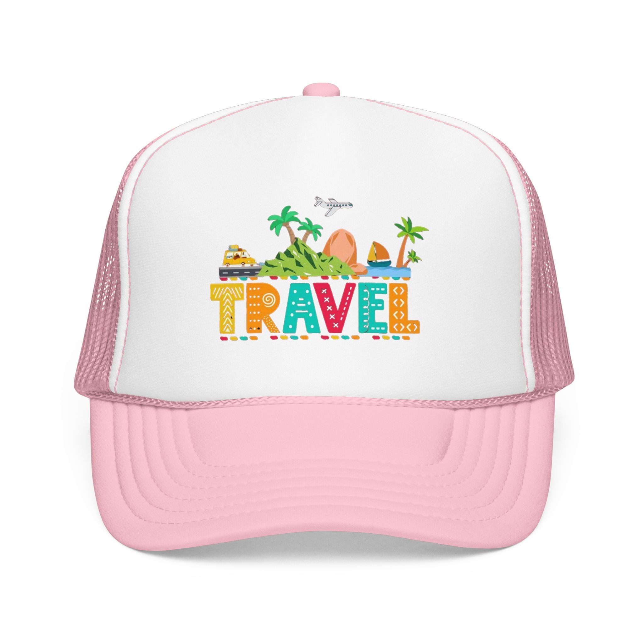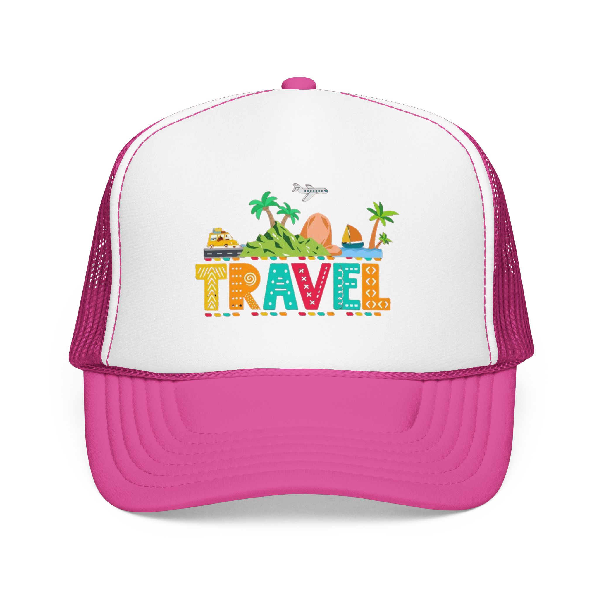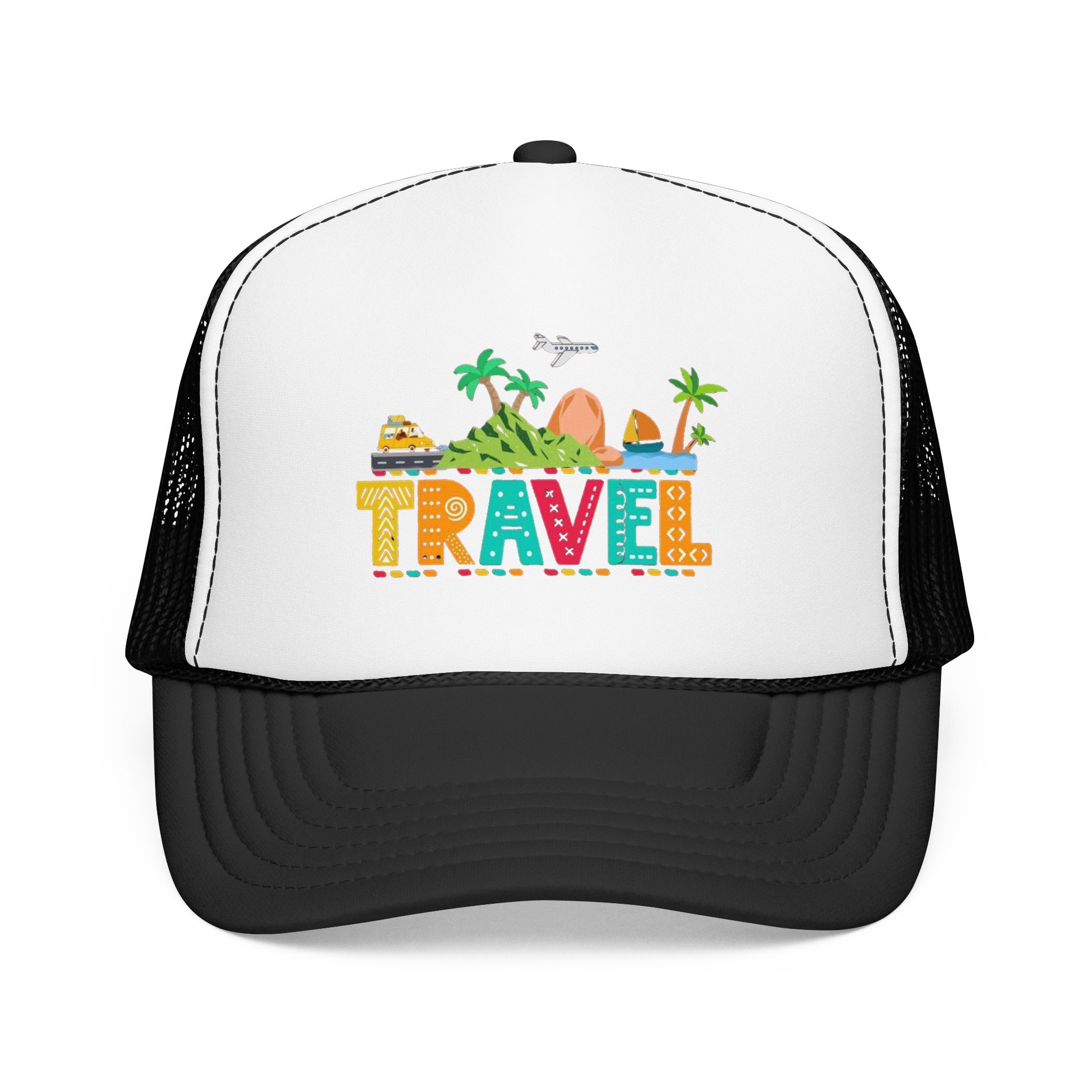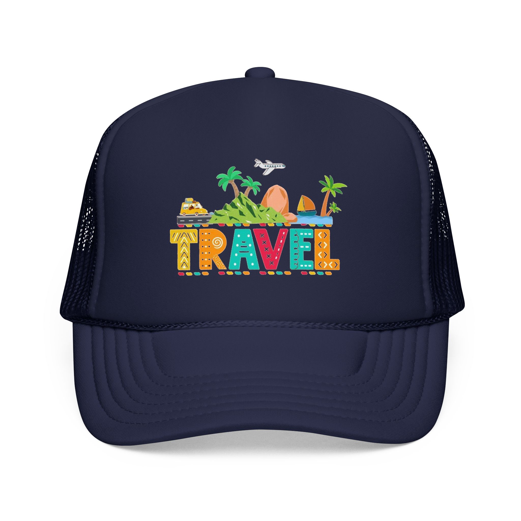 This foam trucker hat brings travel day sunshine to every casual moment. A structured, high-profile foam front shows a colorful, playful TRAVEL graphic—palm trees, waves, mountains, and tiny landmarks—so the hat reads like a small postcard when you wear it. The mesh back keeps you cool on long road trips and summer flights, while the pre-curved visor with eight rows of stitching and matching undervisor give it that polished, lived-in look. The adjustable snap lets you dial in a snug fit, and the thicker laminated foam front holds the design crisp, wash after wash. Wear it on airport runs, weekend escapes, or while planning your next route; it’s made to age into your favorite travel companion.