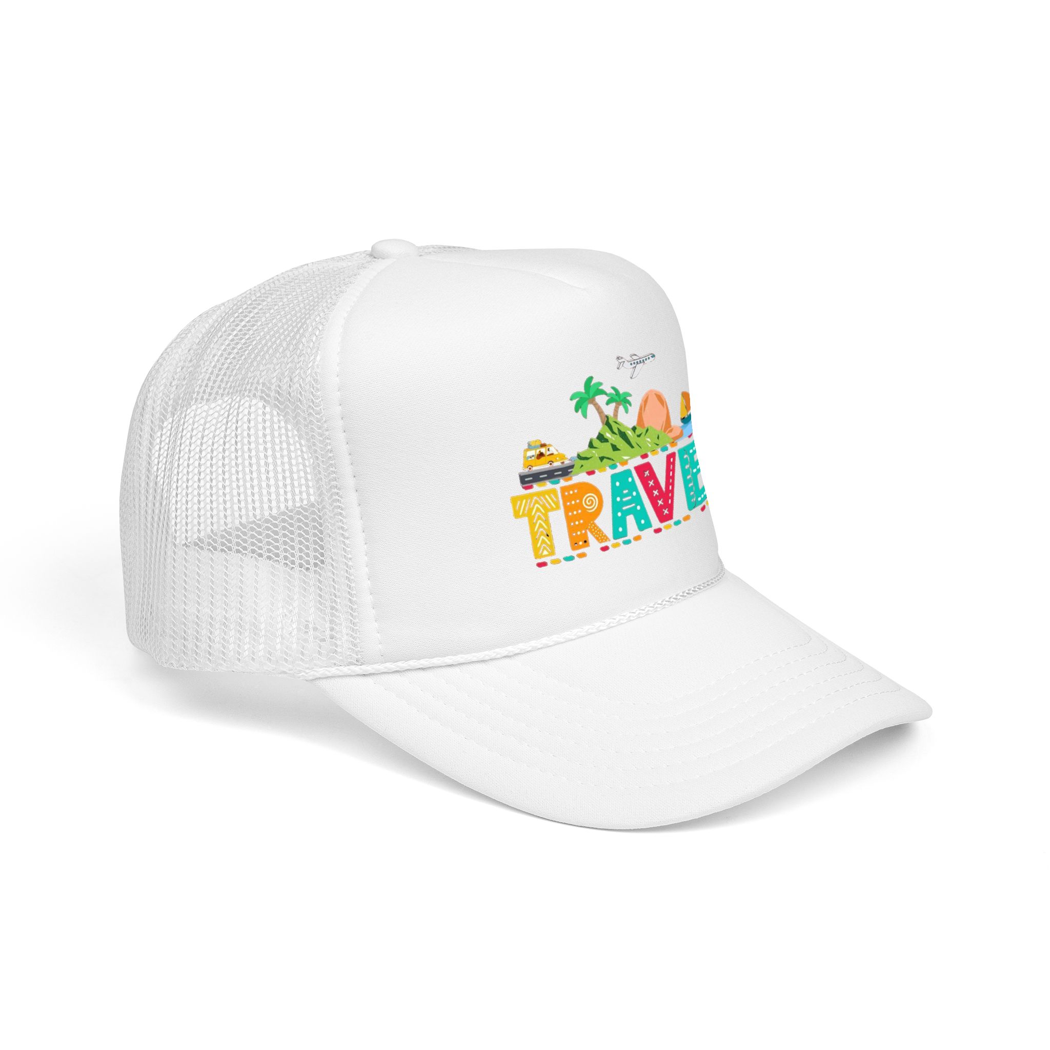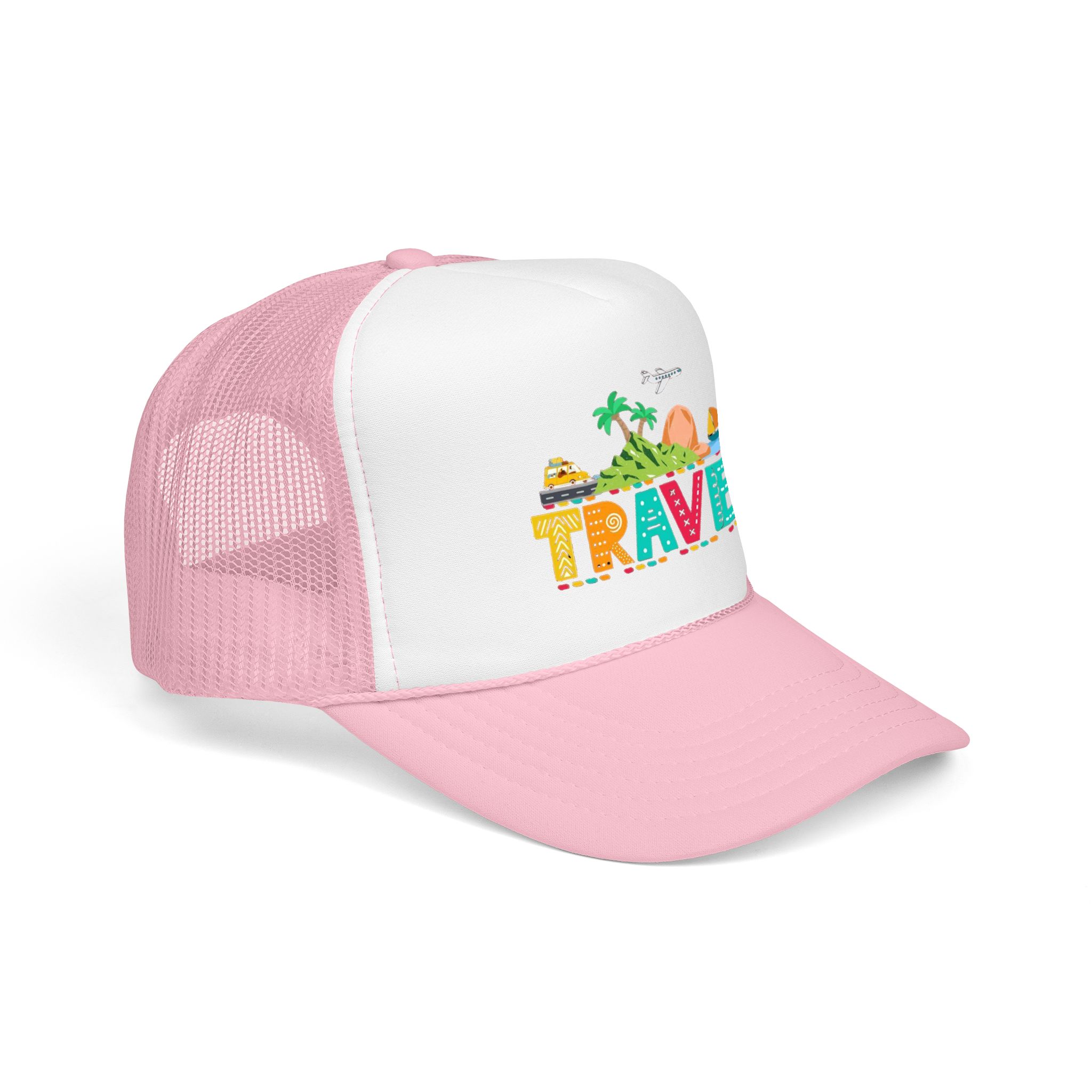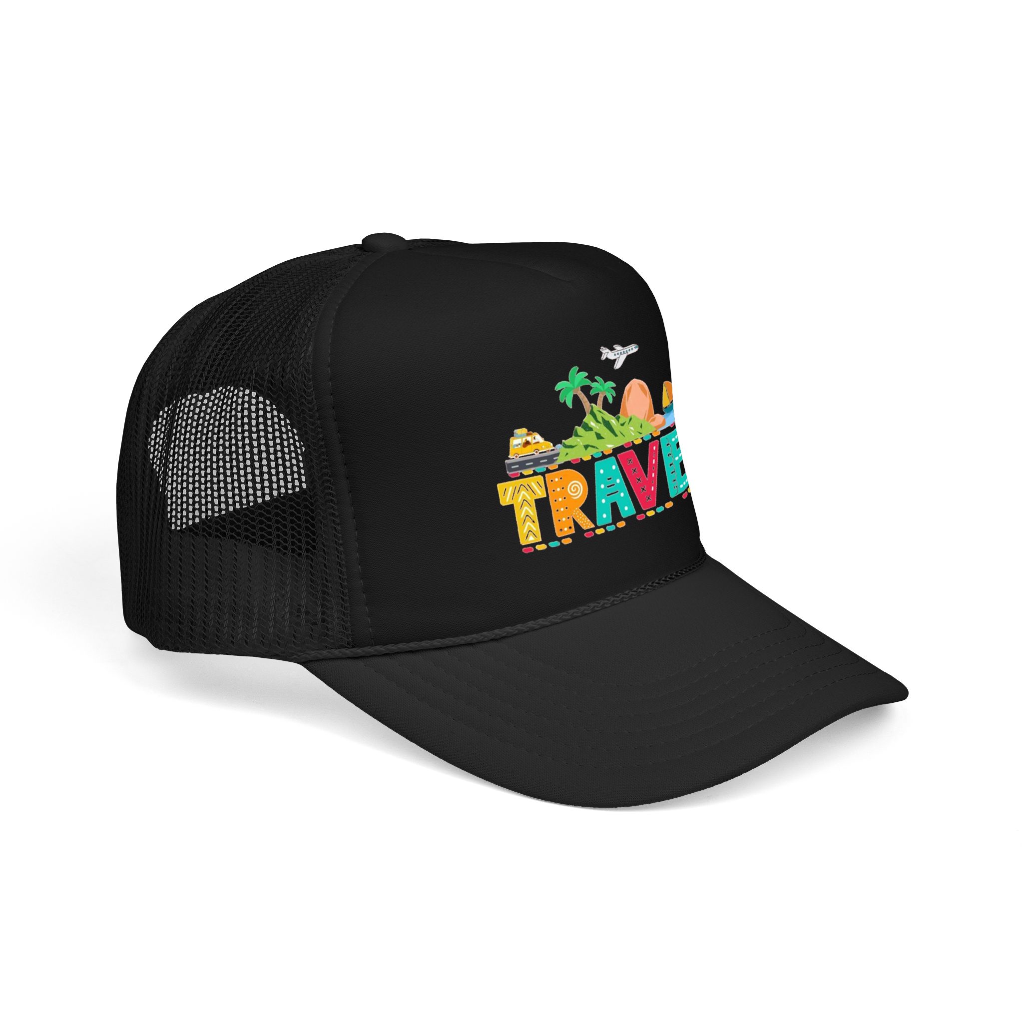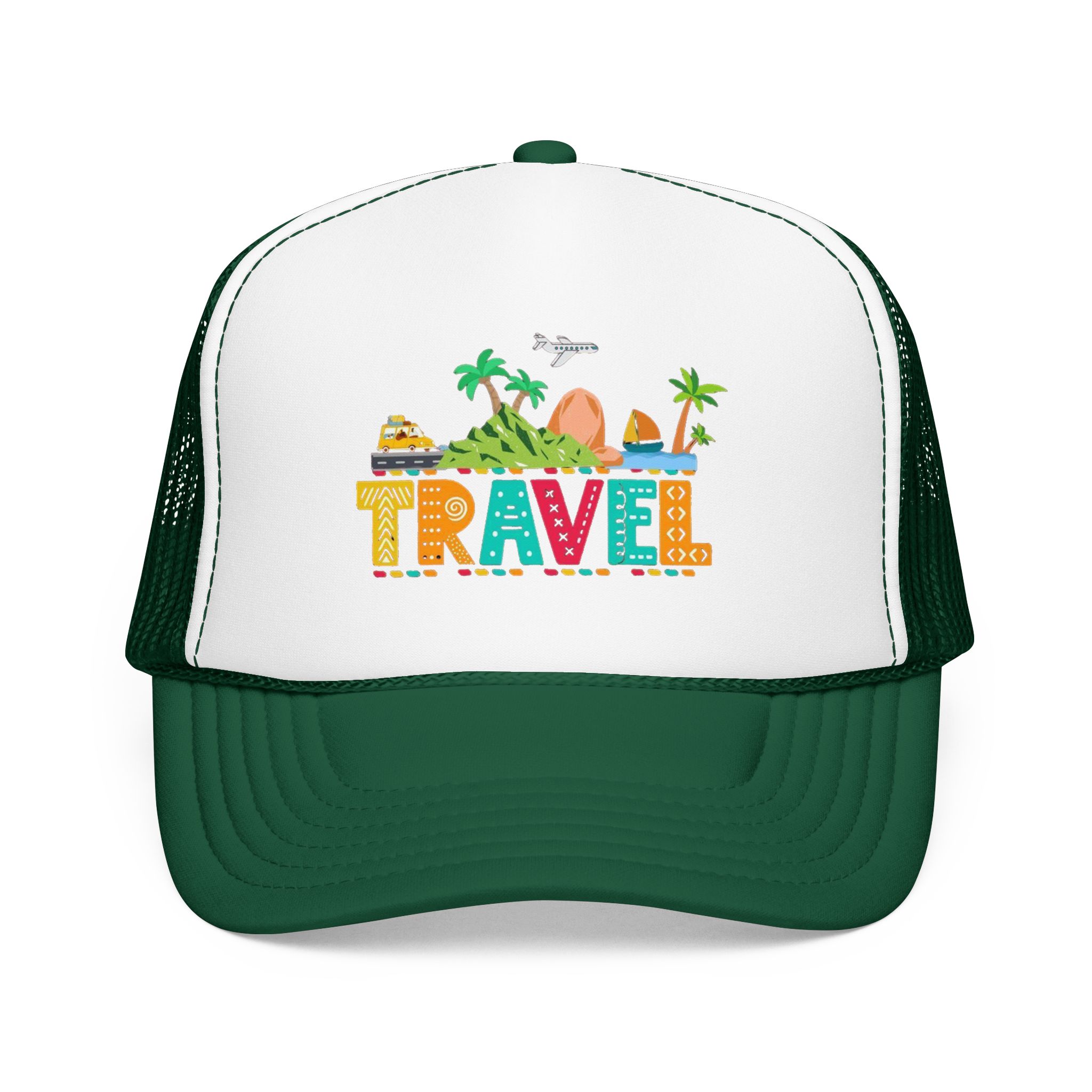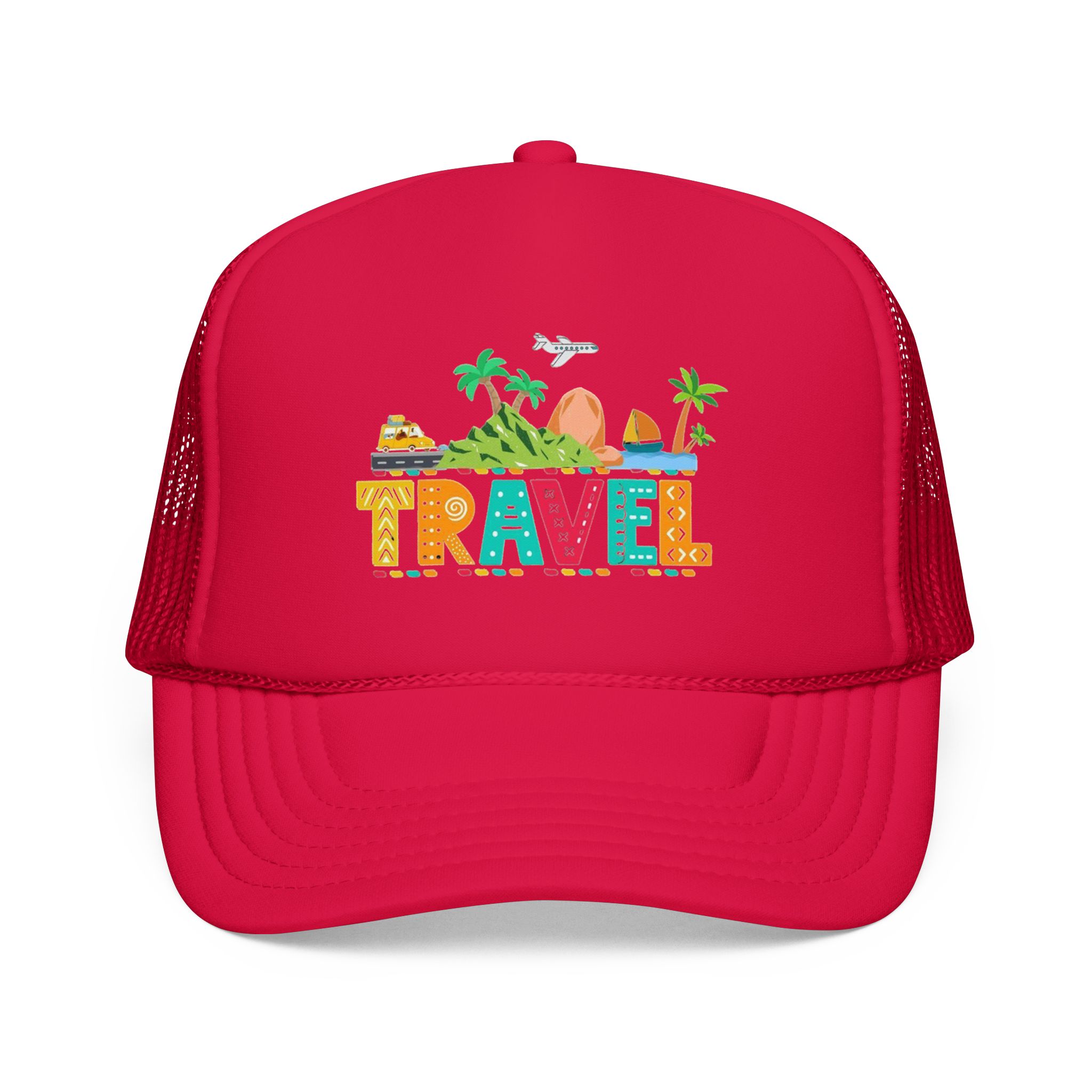 This foam trucker hat brings travel day sunshine to every casual moment. A structured, high-profile foam front shows a colorful, playful TRAVEL graphic—palm trees, waves, mountains, and tiny landmarks—so the hat reads like a small postcard when you wear it. The mesh back keeps you cool on long road trips and summer flights, while the pre-curved visor with eight rows of stitching and matching undervisor give it that polished, lived-in look. The adjustable snap lets you dial in a snug fit, and the thicker laminated foam front holds the design crisp, wash after wash. Wear it on airport runs, weekend escapes, or while planning your next route; it’s made to age into your favorite travel companion.