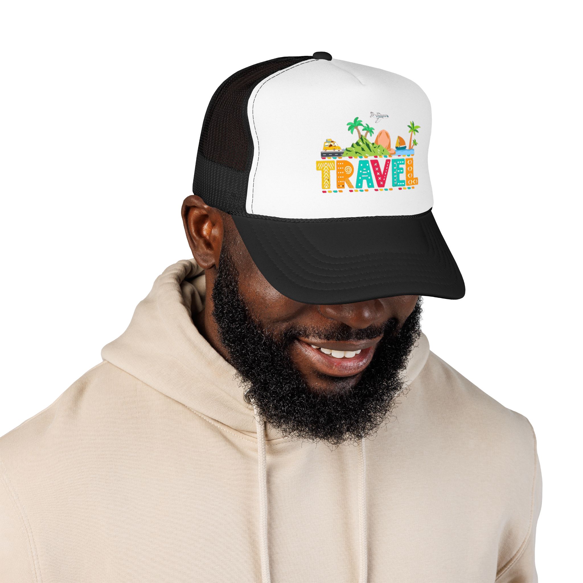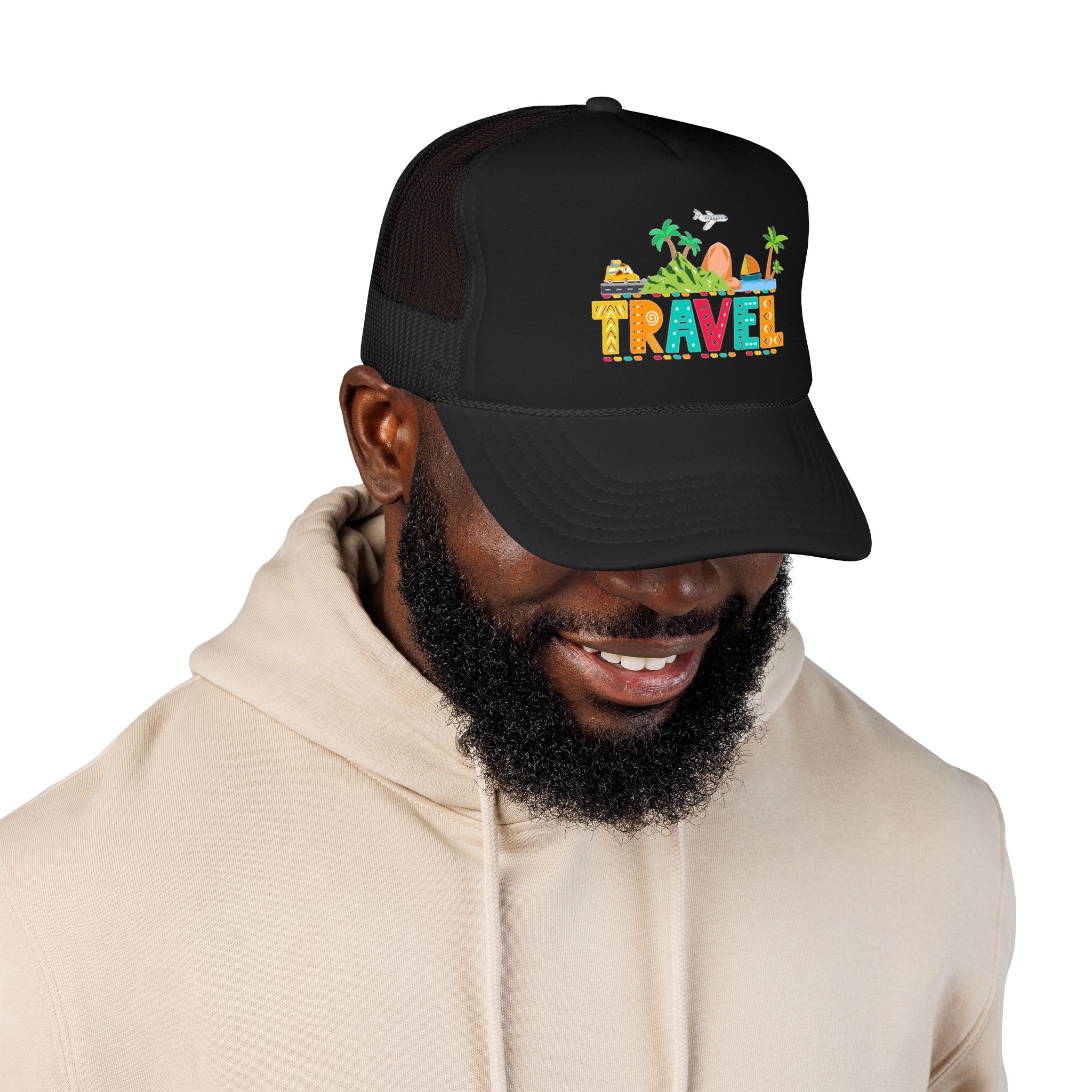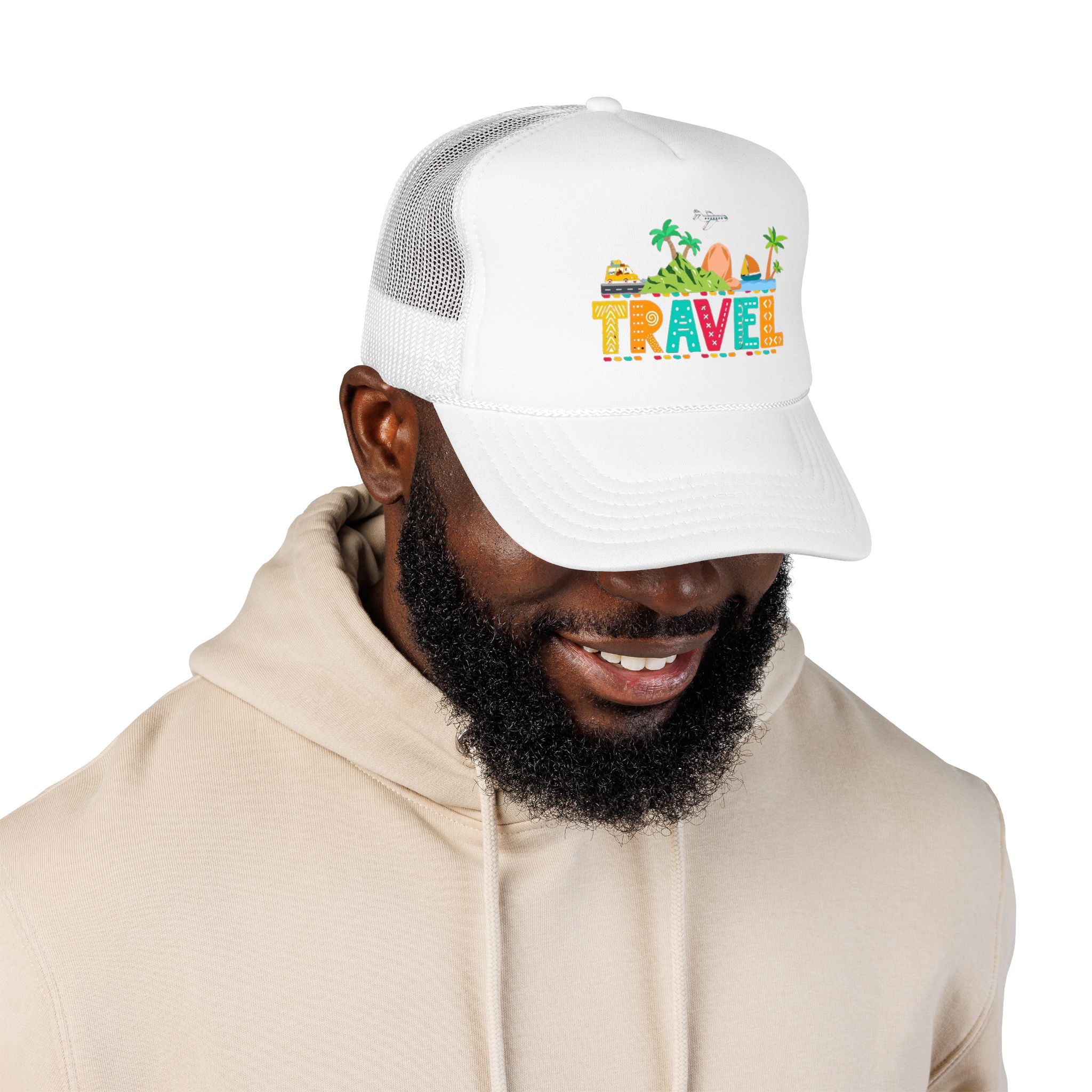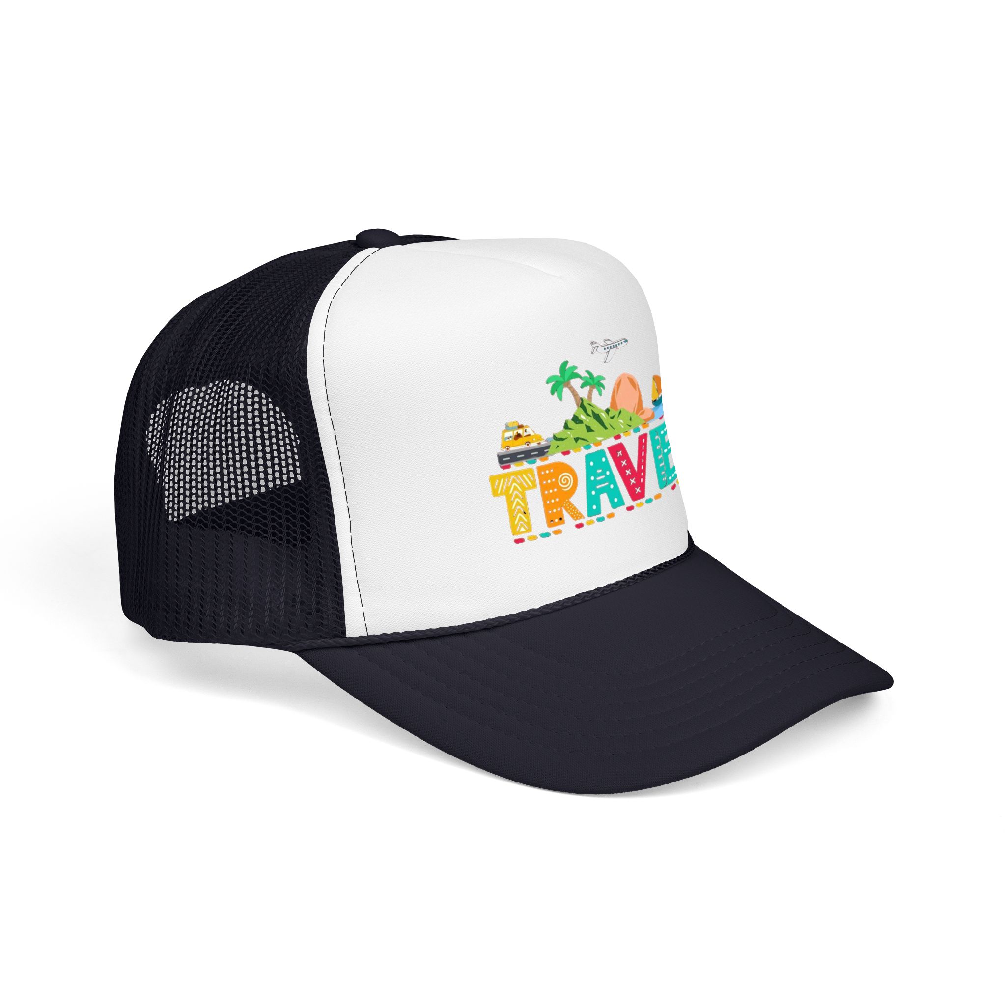 This foam trucker hat brings travel day sunshine to every casual moment. A structured, high-profile foam front shows a colorful, playful TRAVEL graphic—palm trees, waves, mountains, and tiny landmarks—so the hat reads like a small postcard when you wear it. The mesh back keeps you cool on long road trips and summer flights, while the pre-curved visor with eight rows of stitching and matching undervisor give it that polished, lived-in look. The adjustable snap lets you dial in a snug fit, and the thicker laminated foam front holds the design crisp, wash after wash. Wear it on airport runs, weekend escapes, or while planning your next route; it’s made to age into your favorite travel companion.