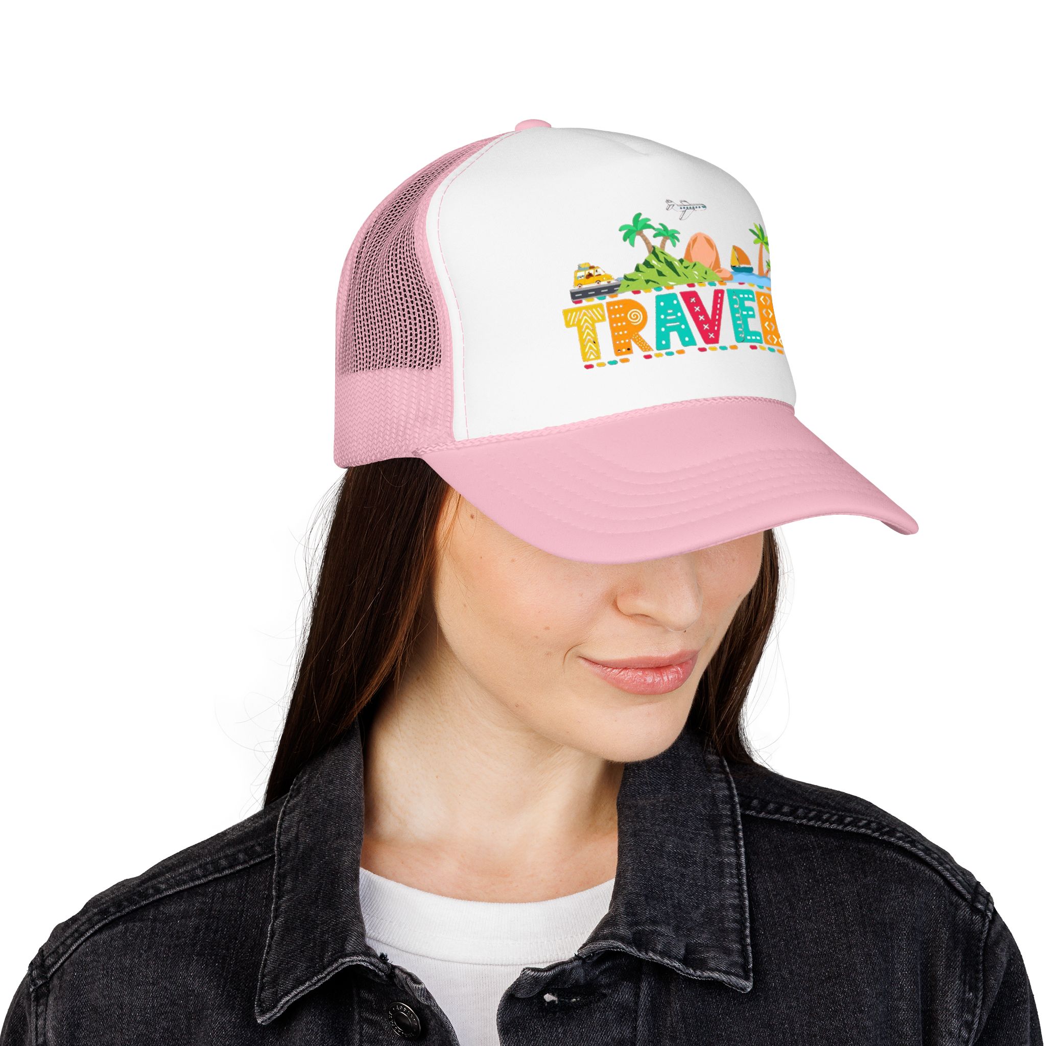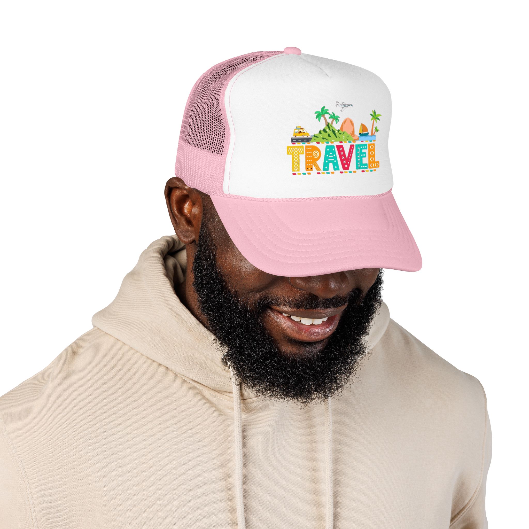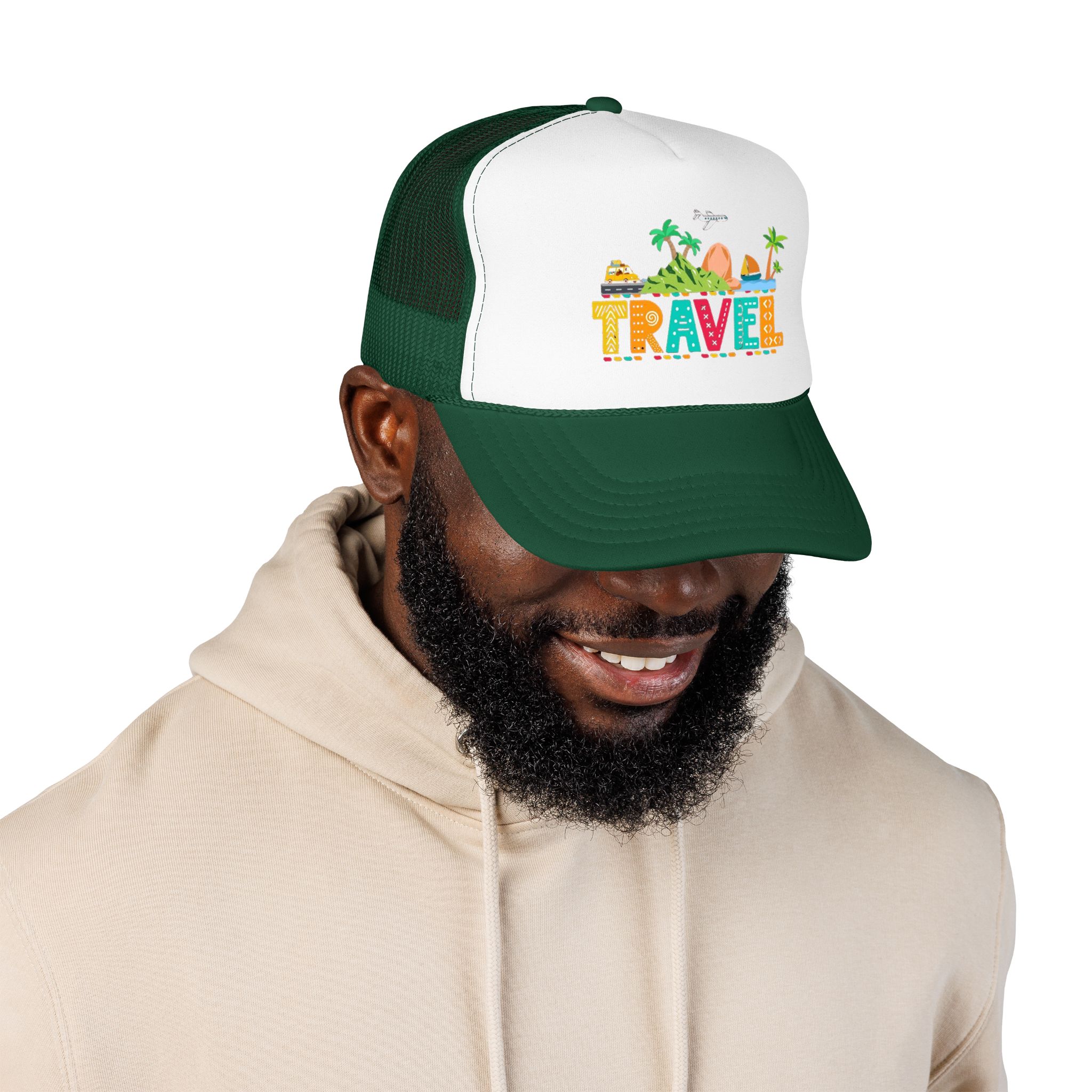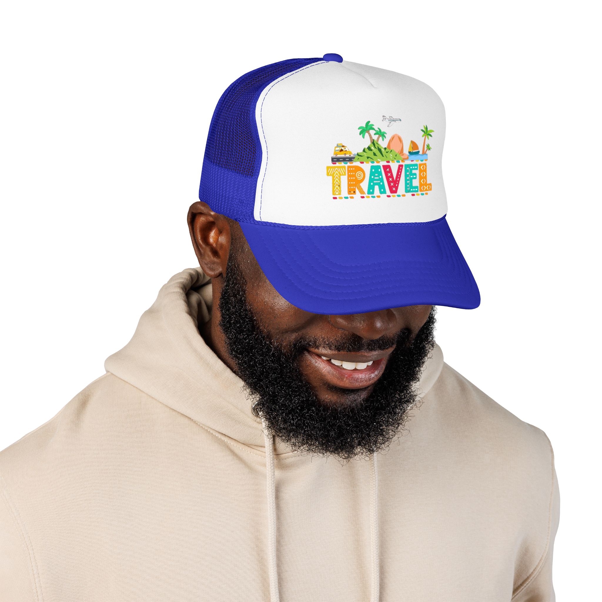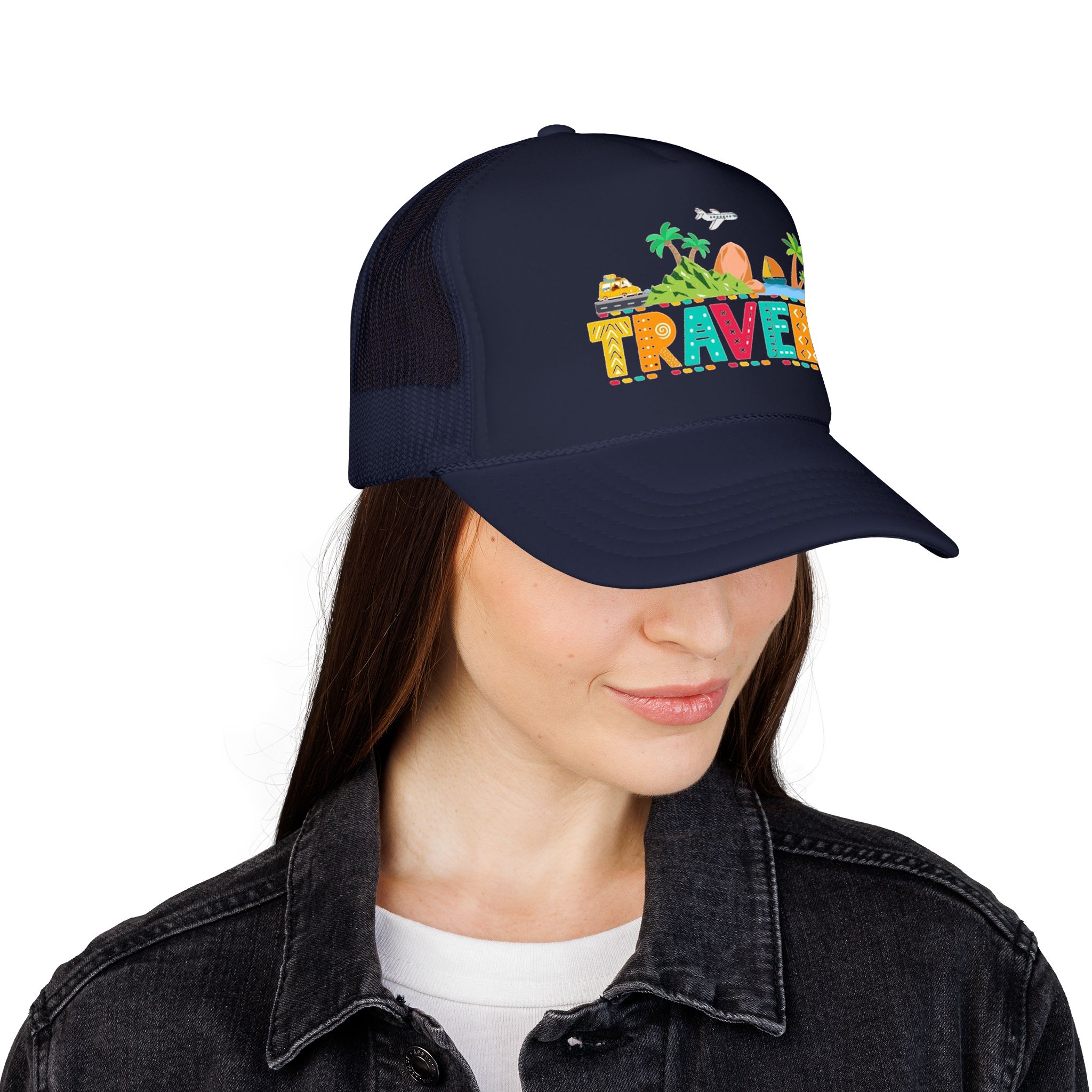 This foam trucker hat brings travel day sunshine to every casual moment. A structured, high-profile foam front shows a colorful, playful TRAVEL graphic—palm trees, waves, mountains, and tiny landmarks—so the hat reads like a small postcard when you wear it. The mesh back keeps you cool on long road trips and summer flights, while the pre-curved visor with eight rows of stitching and matching undervisor give it that polished, lived-in look. The adjustable snap lets you dial in a snug fit, and the thicker laminated foam front holds the design crisp, wash after wash. Wear it on airport runs, weekend escapes, or while planning your next route; it’s made to age into your favorite travel companion.