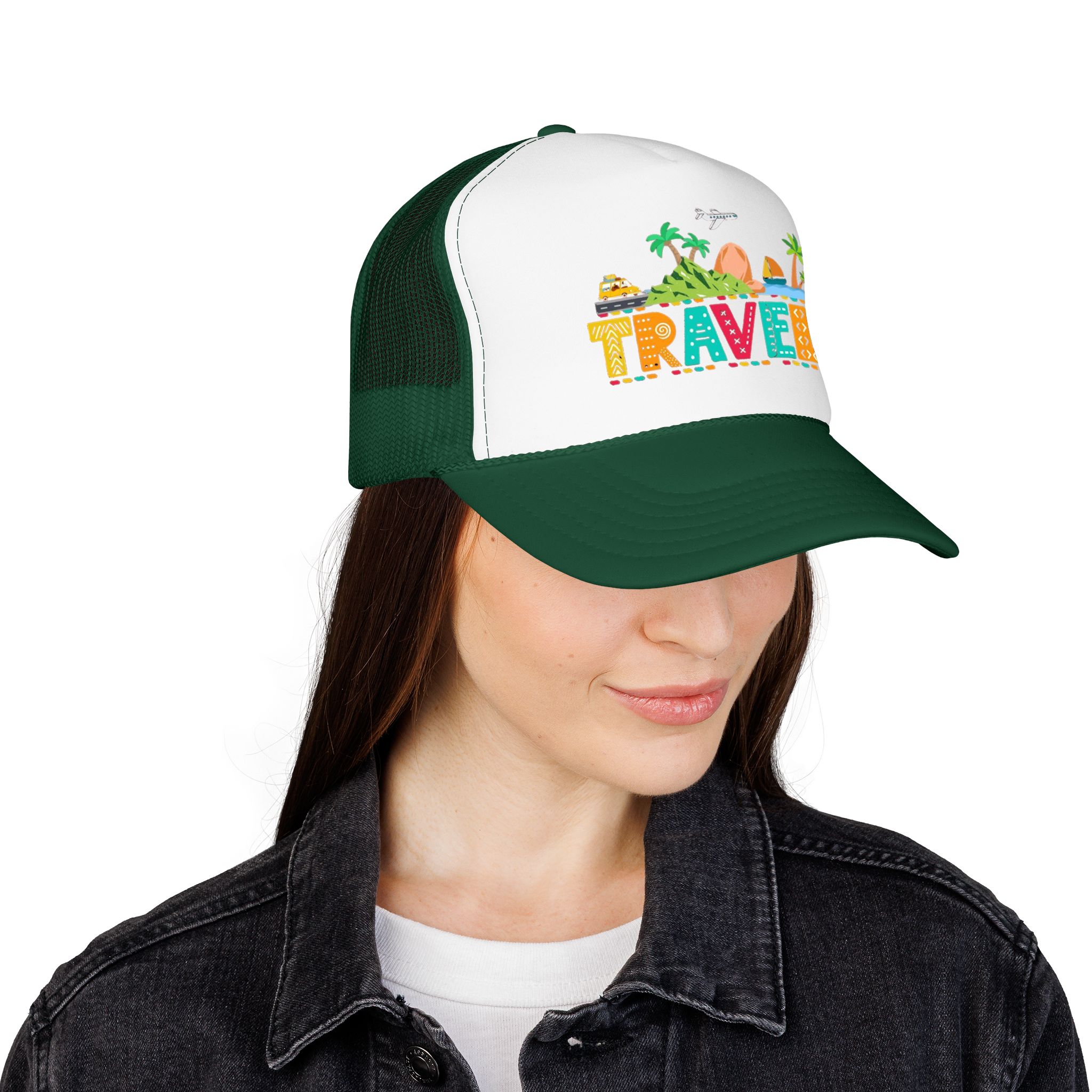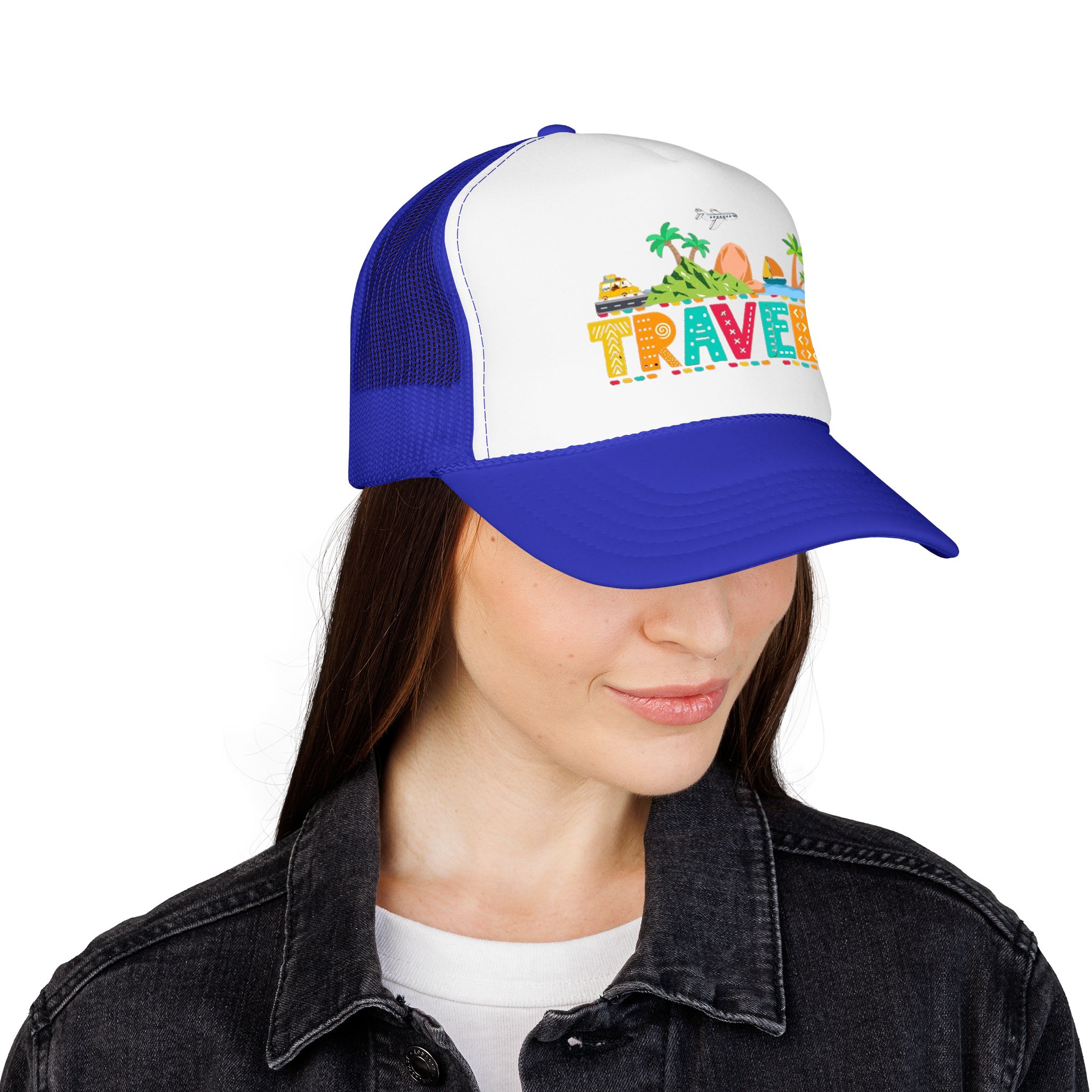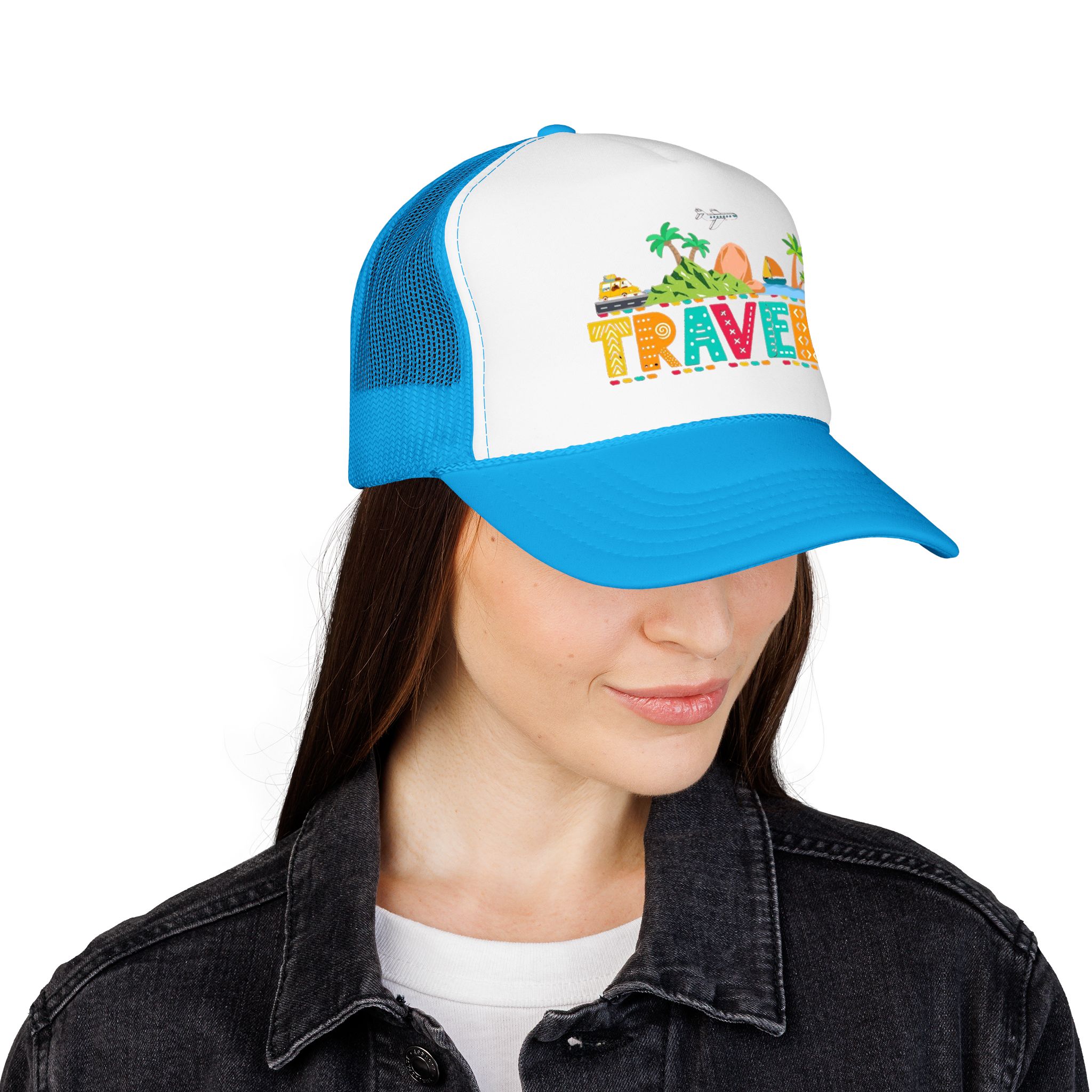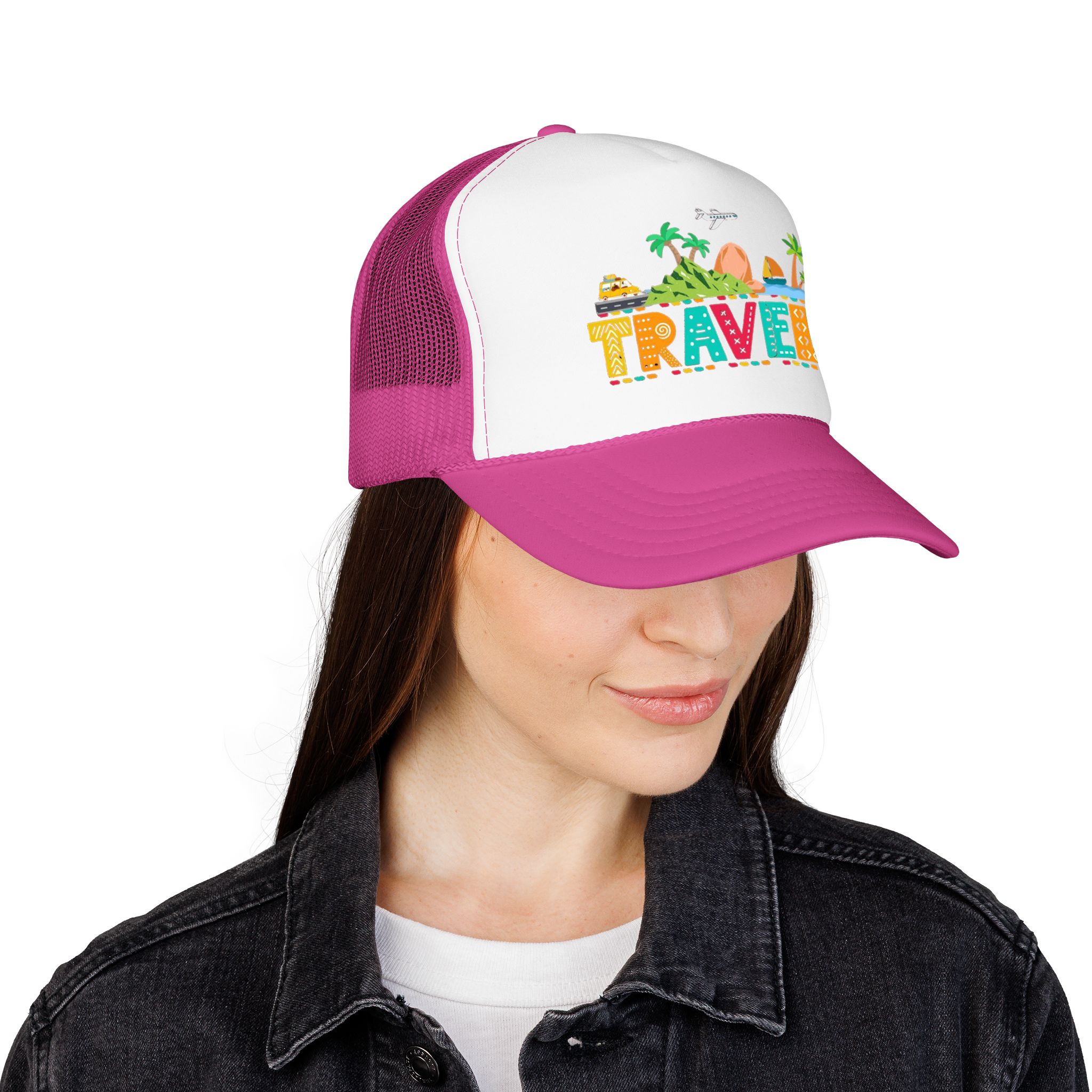 This foam trucker hat brings travel day sunshine to every casual moment. A structured, high-profile foam front shows a colorful, playful TRAVEL graphic—palm trees, waves, mountains, and tiny landmarks—so the hat reads like a small postcard when you wear it. The mesh back keeps you cool on long road trips and summer flights, while the pre-curved visor with eight rows of stitching and matching undervisor give it that polished, lived-in look. The adjustable snap lets you dial in a snug fit, and the thicker laminated foam front holds the design crisp, wash after wash. Wear it on airport runs, weekend escapes, or while planning your next route; it’s made to age into your favorite travel companion.