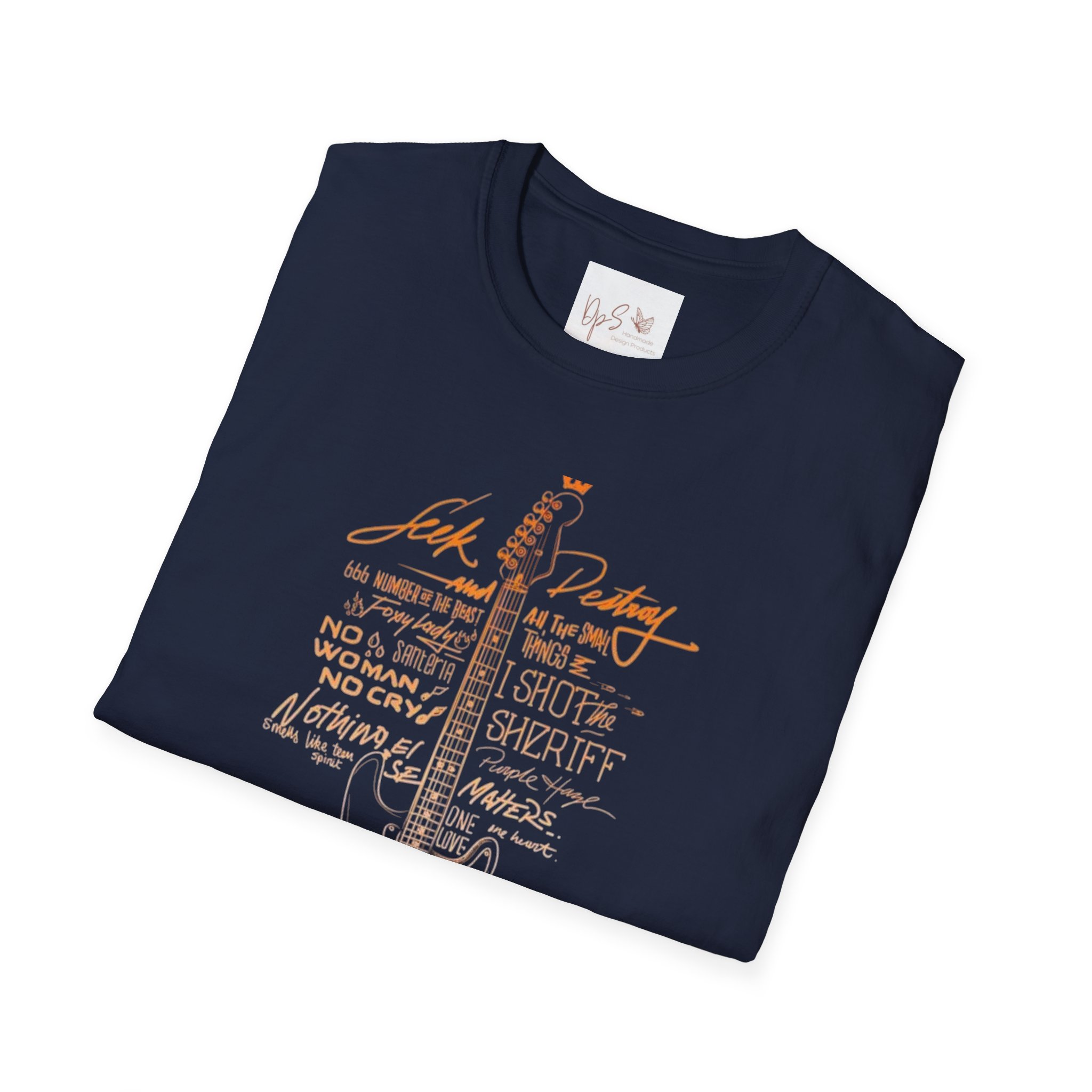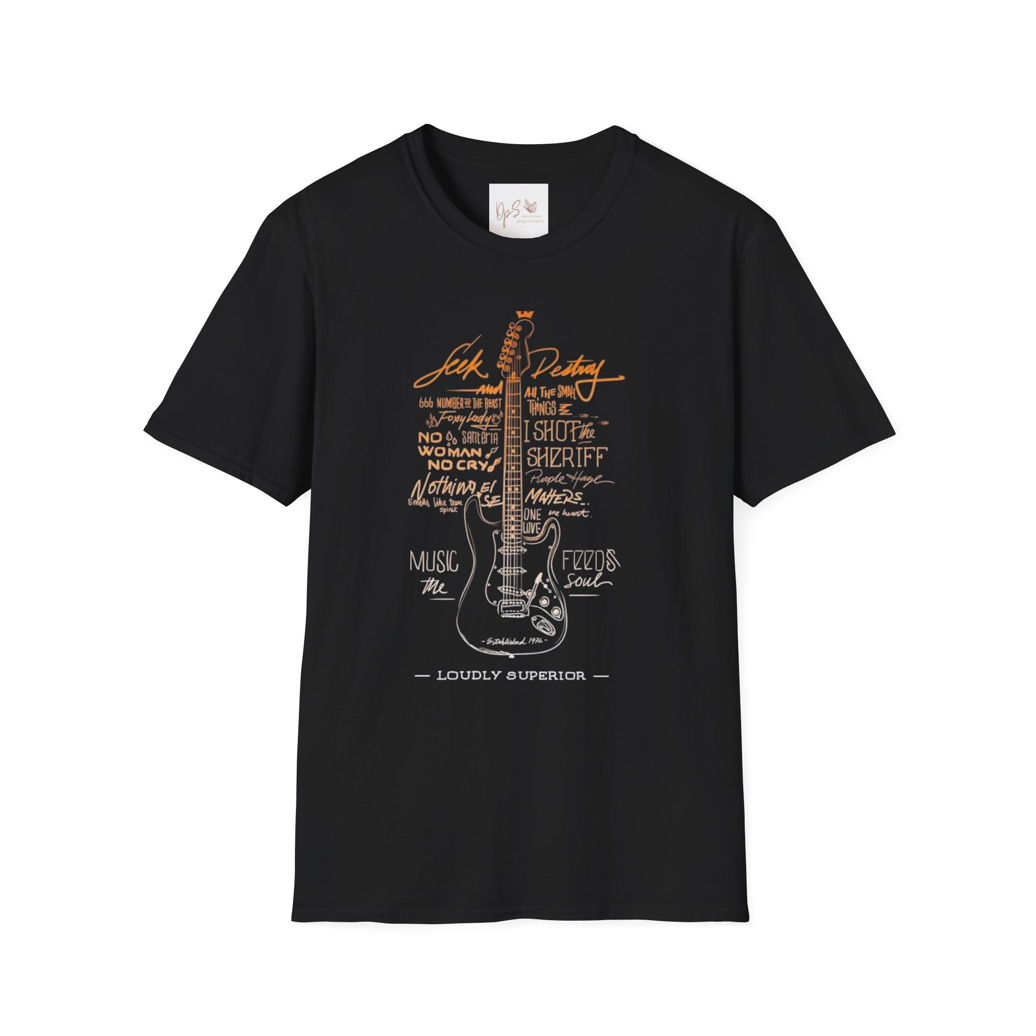 This soft, lightweight tee brings the roadhouse and guitar-room vibe straight into everyday wear. The front features a hand-drawn electric guitar illustration with vintage lettering and lyric-like lines that read like a lived-in playlist. On black it reads warm and a little gritty — like late-night songs, neon bars, and open highways. The fabric is breathable and smooth; the cut sits clean at the shoulders and chest so the artwork stays front-and-center. Wear it to rehearsal, a backyard jam, or when you want to carry that familiar soundtrack with you.