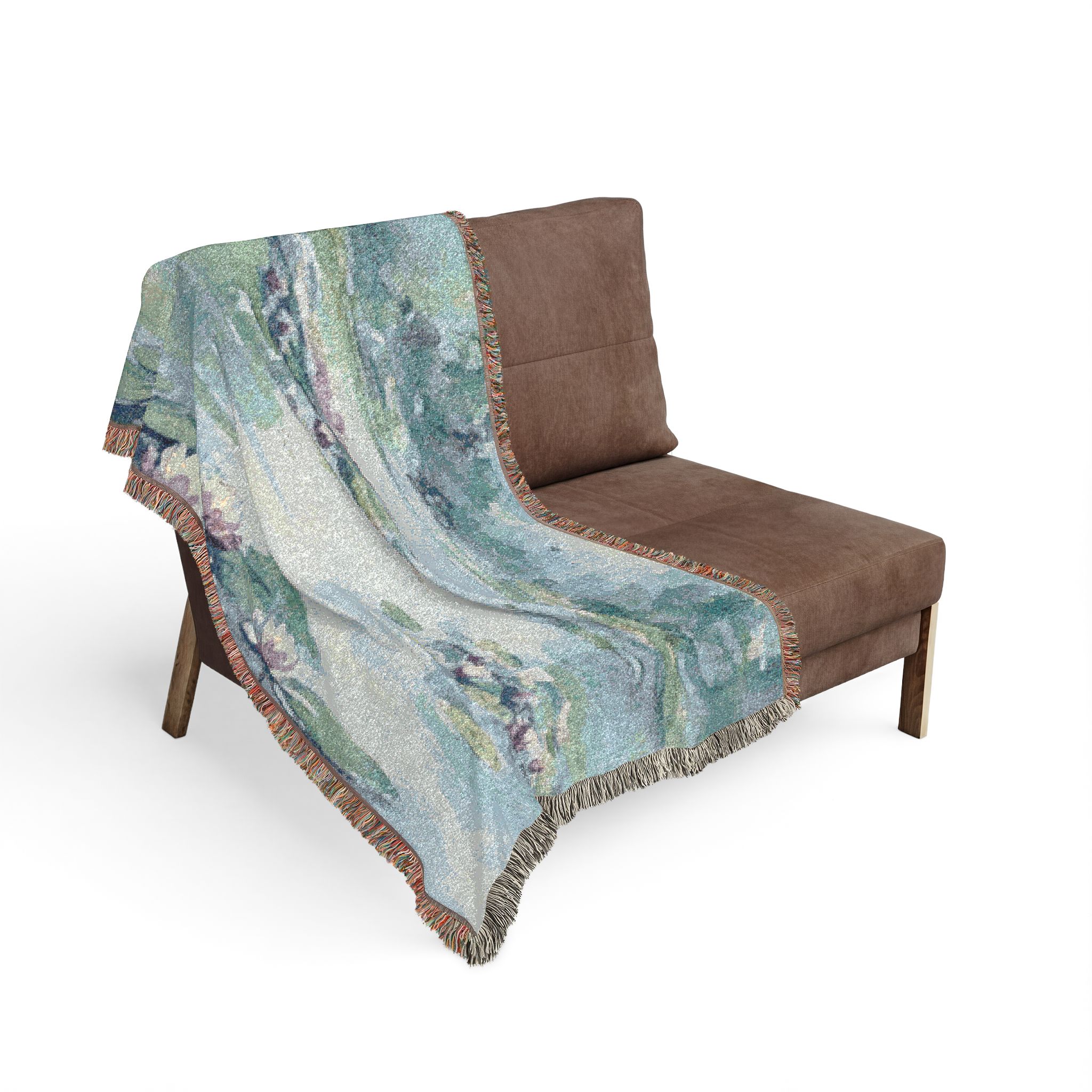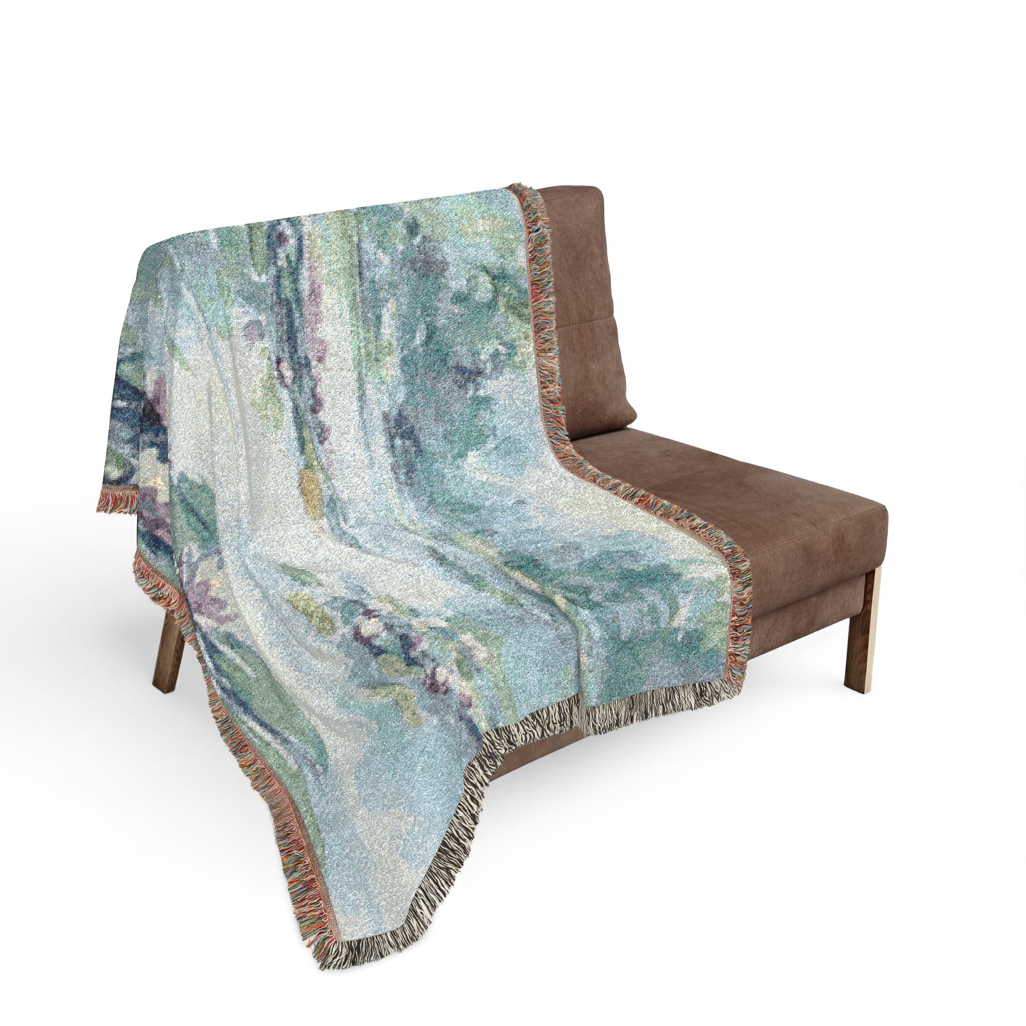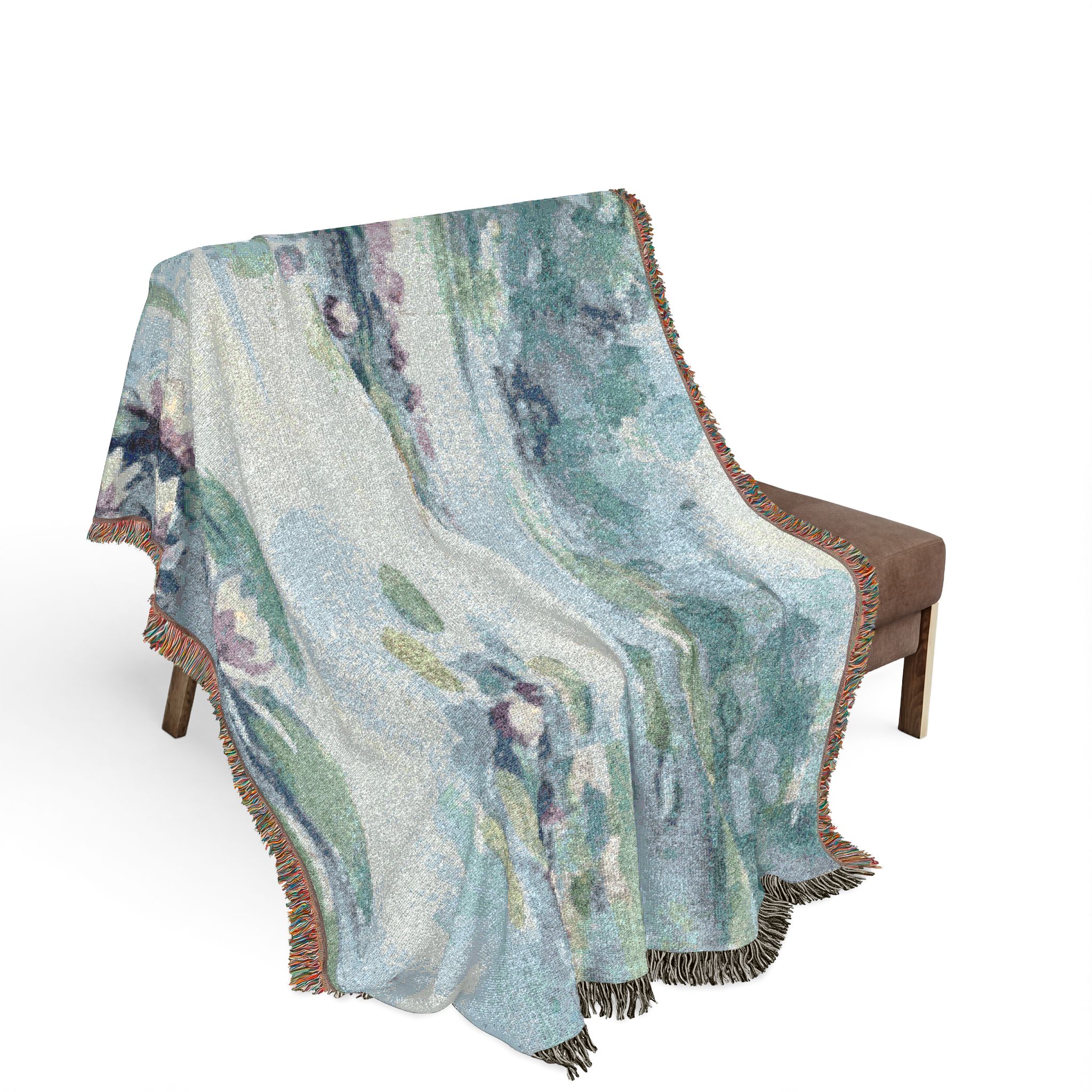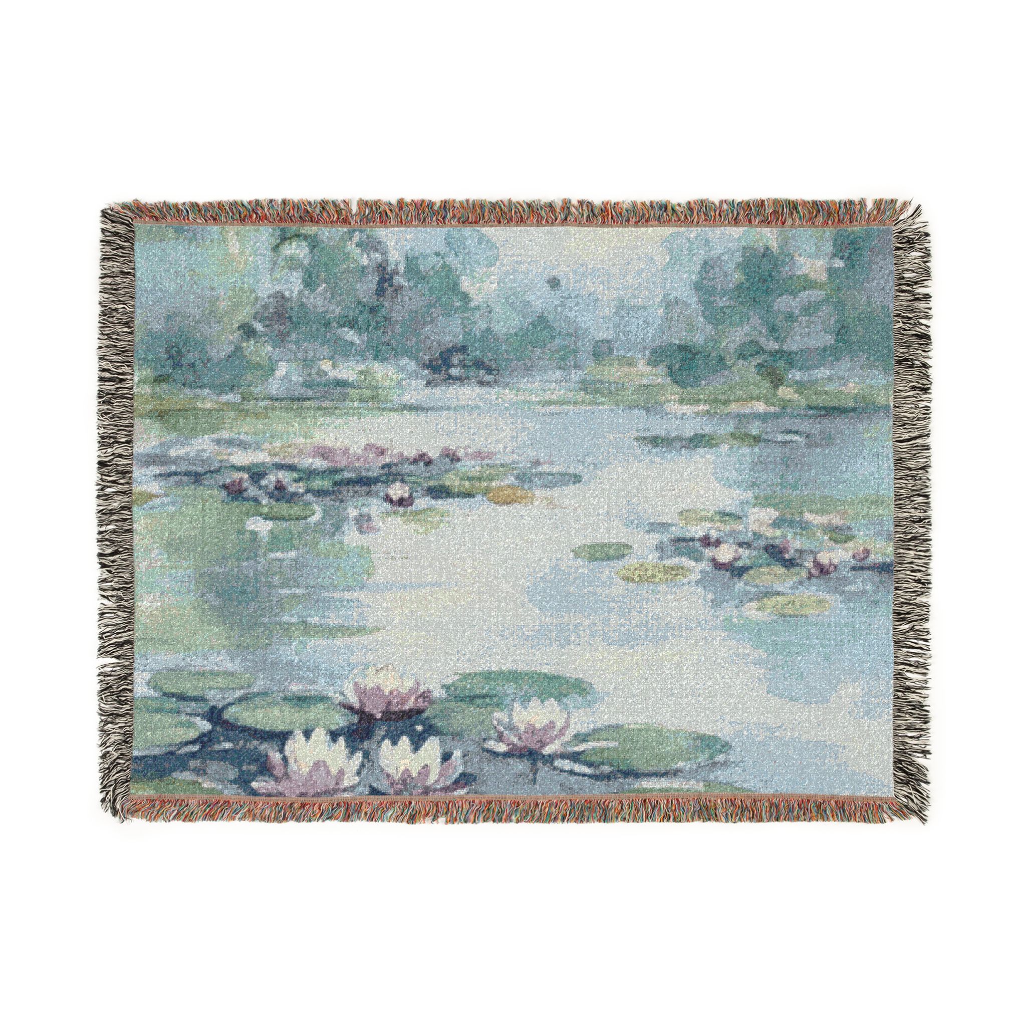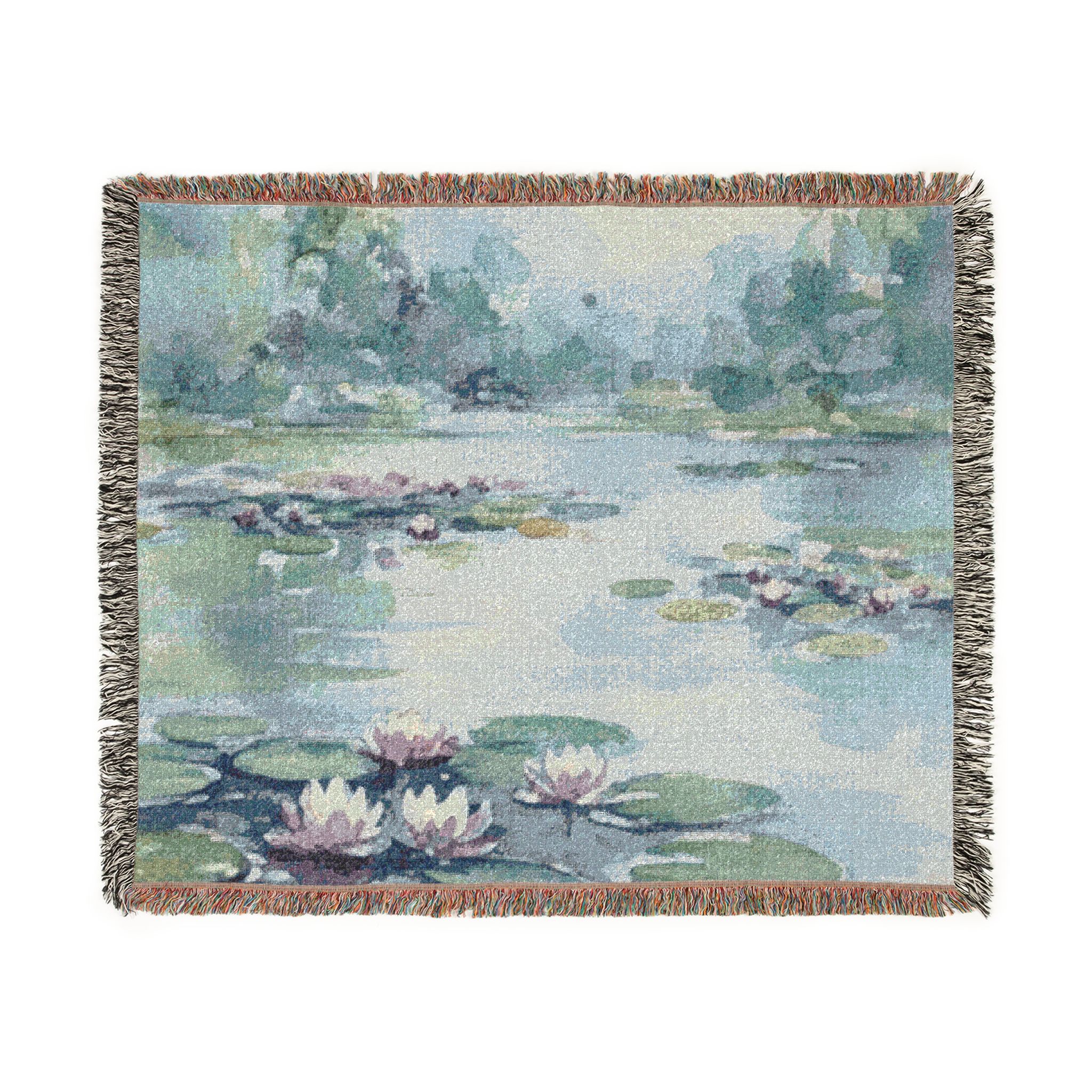 Waterlilies tapestry Woven Blanket | Impressionist lake scene, pastel blue green