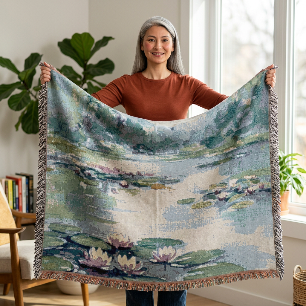 A woven cotton blanket that feels like a quiet afternoon by the water. Lightweight but sturdy, the textured weave brings painted scenes to life—soft lilies and misty reflections on one side, deeper, moody tones on the other. The colorful fringed edges add an artisanal finish that frames the art and warms any seating area. Choose the Artwork variant for bold, clean color blocks or the Photo variant for nuanced, photographic detail. Draped over a sofa, folded at the foot of a bed, or spread for a cozy reading nook, this blanket creates a calm, collected atmosphere that invites you to slow down and linger.