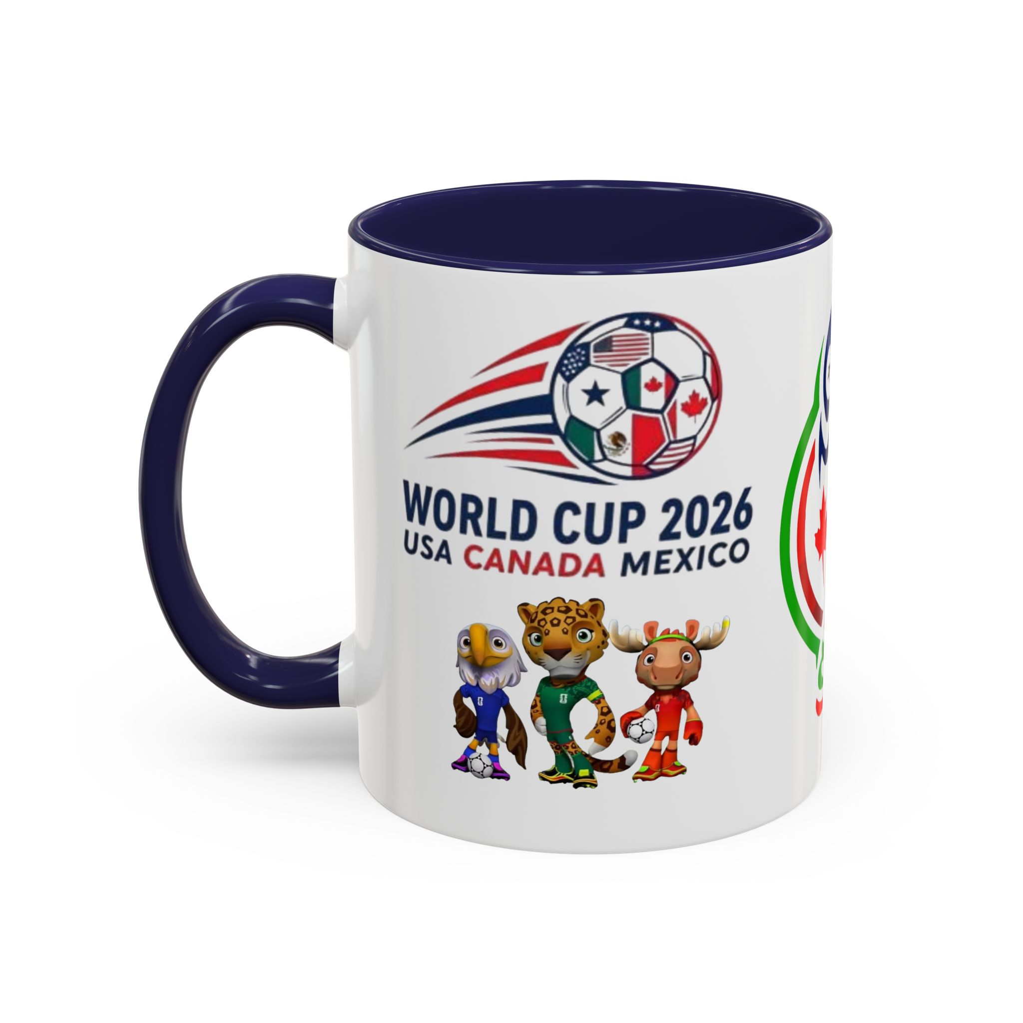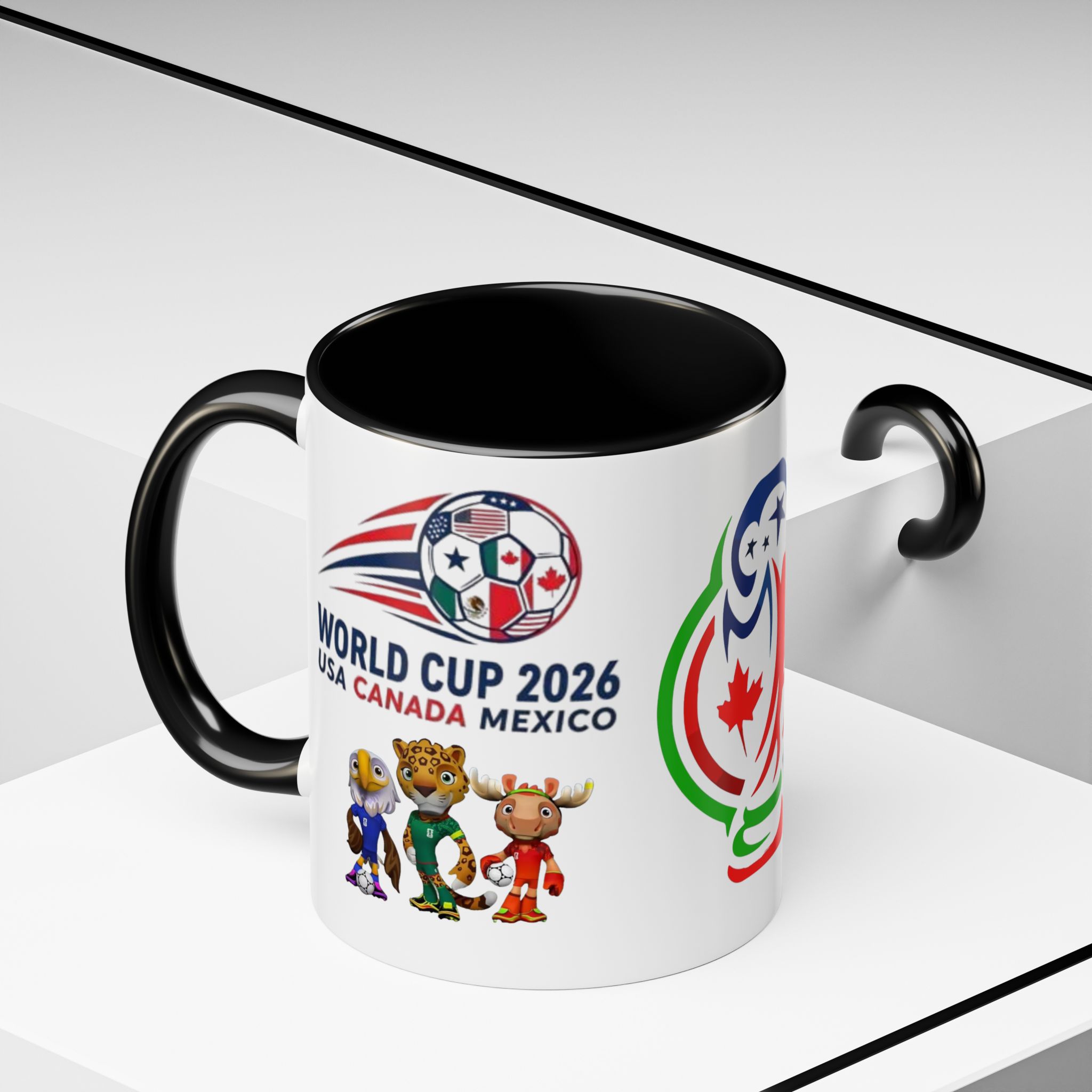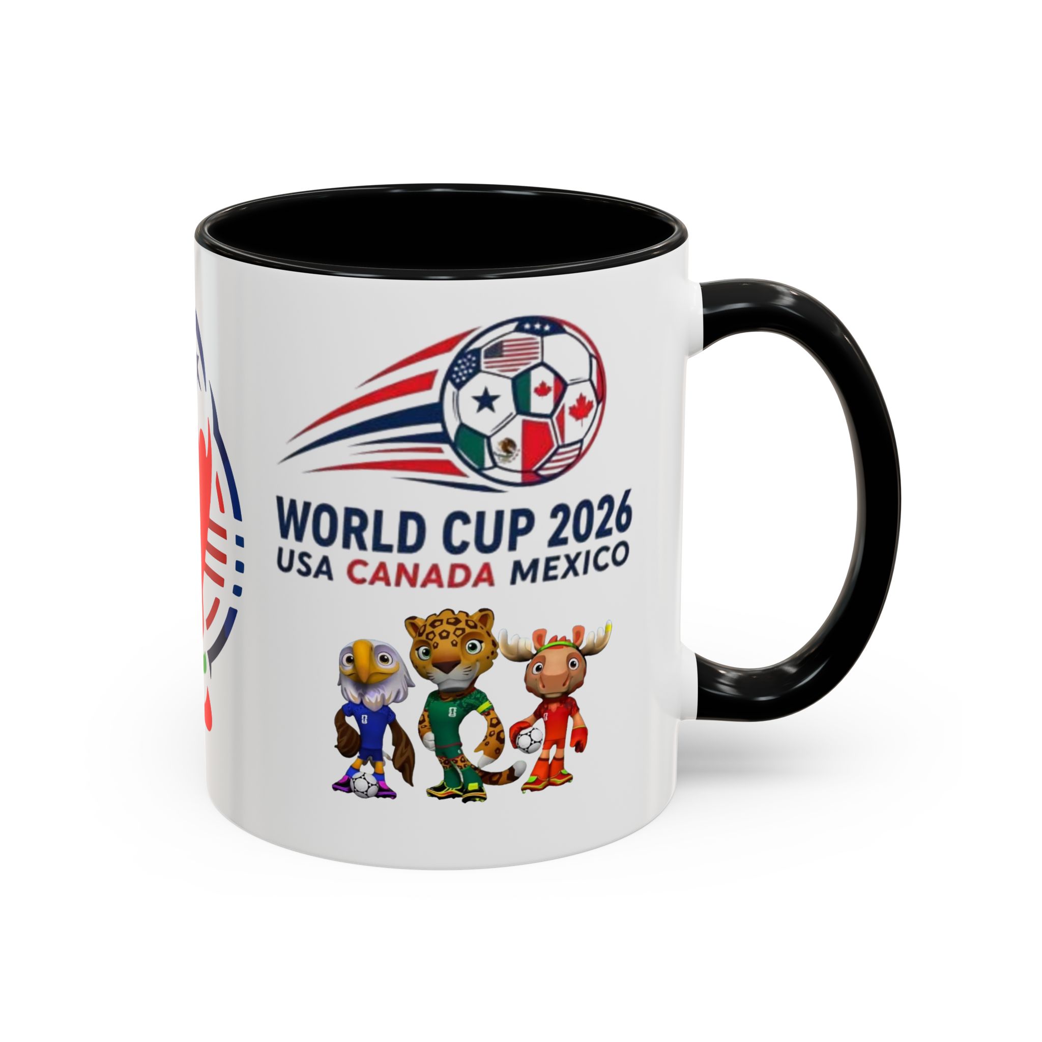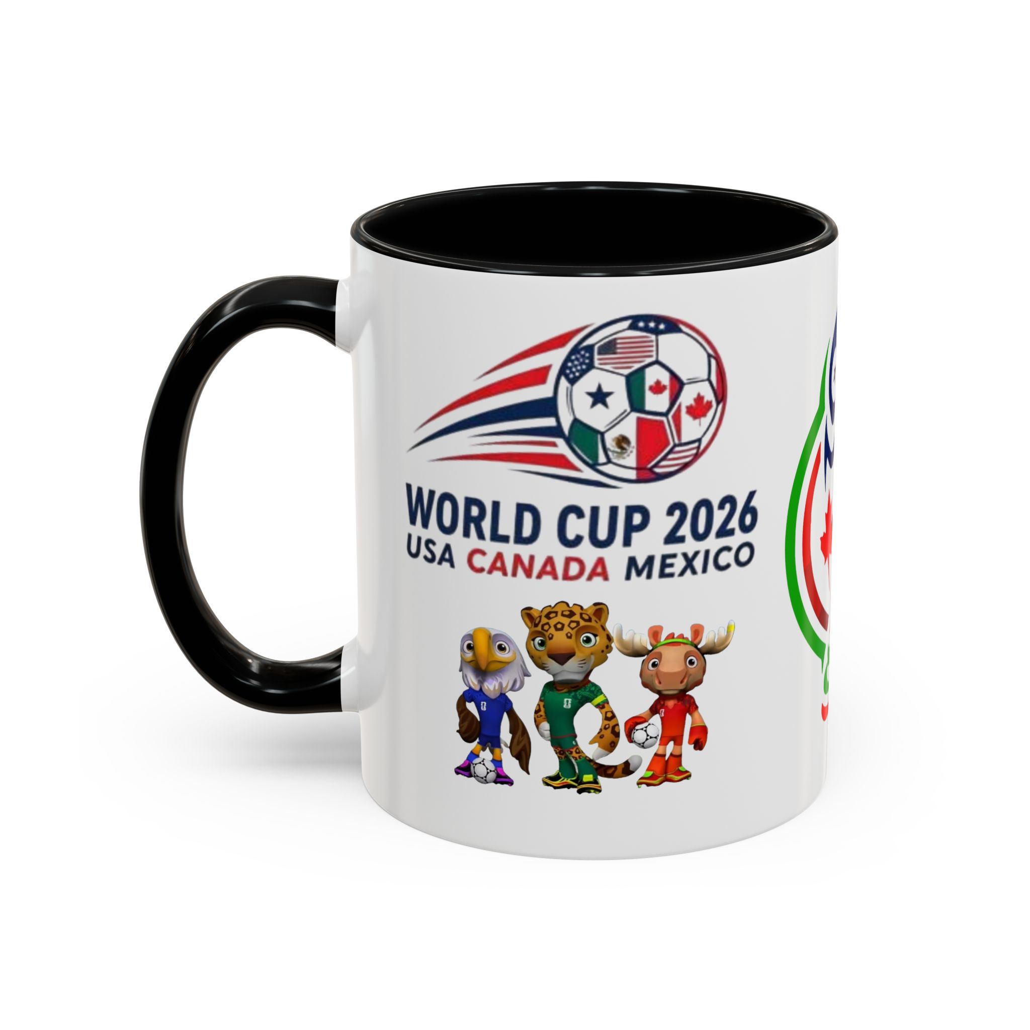 Feel the excitement of kickoff every morning with this colorful soccer-themed mug. The glossy white ceramic contrasts with a bold black interior and handle, wrapping your favorite brew in vibrant World Cup 2026 motifs. Imagery from USA, Canada, and Mexico circles the cup—mini mascots and a stylized trophy bring playful energy to your routine. It sits comfortably in hand with a C-shaped handle and gives off a stadium-bright vibe at home, the office, or while watching matches with friends. Durable, bright prints hold up through daily use so the colors stay lively as you cheer on the teams.