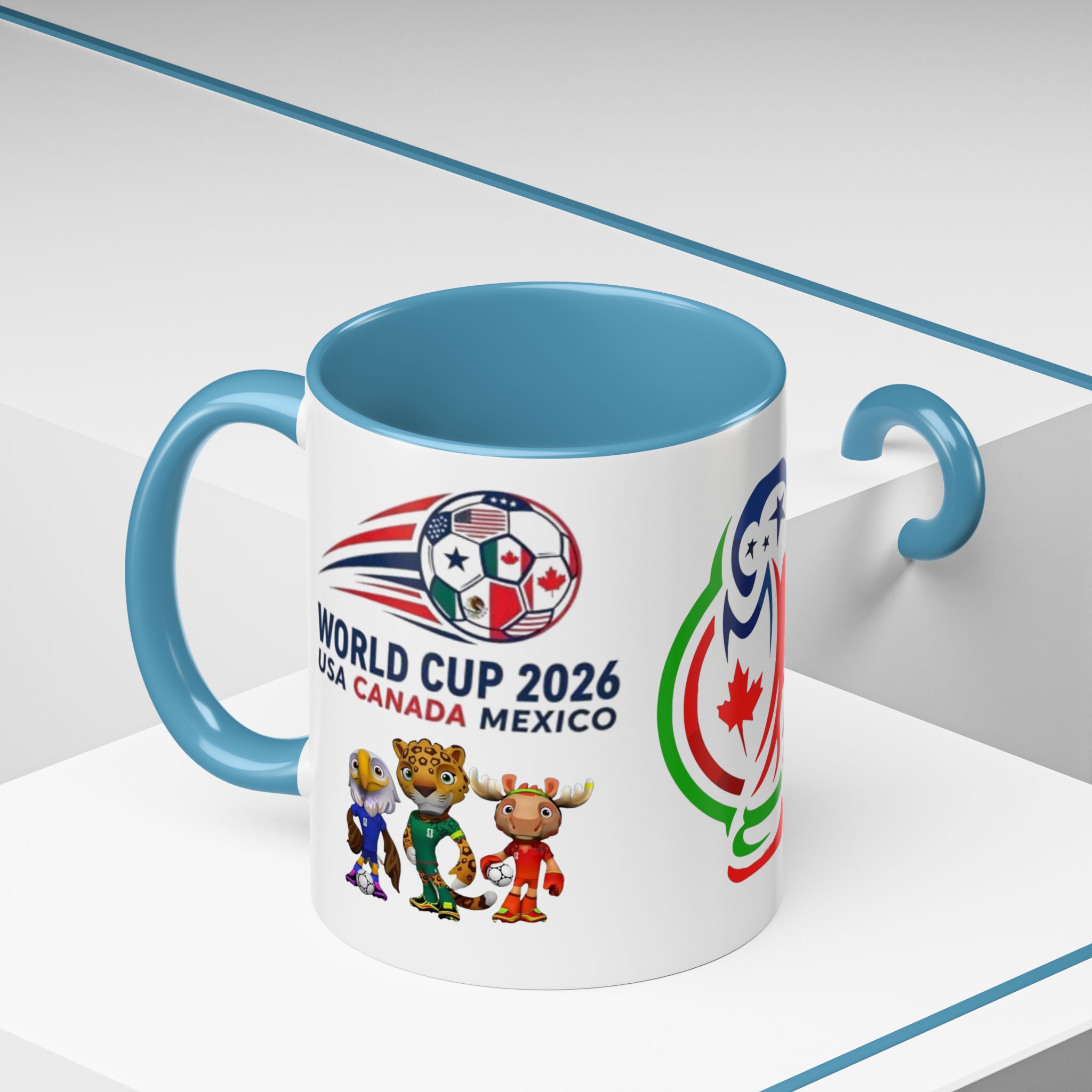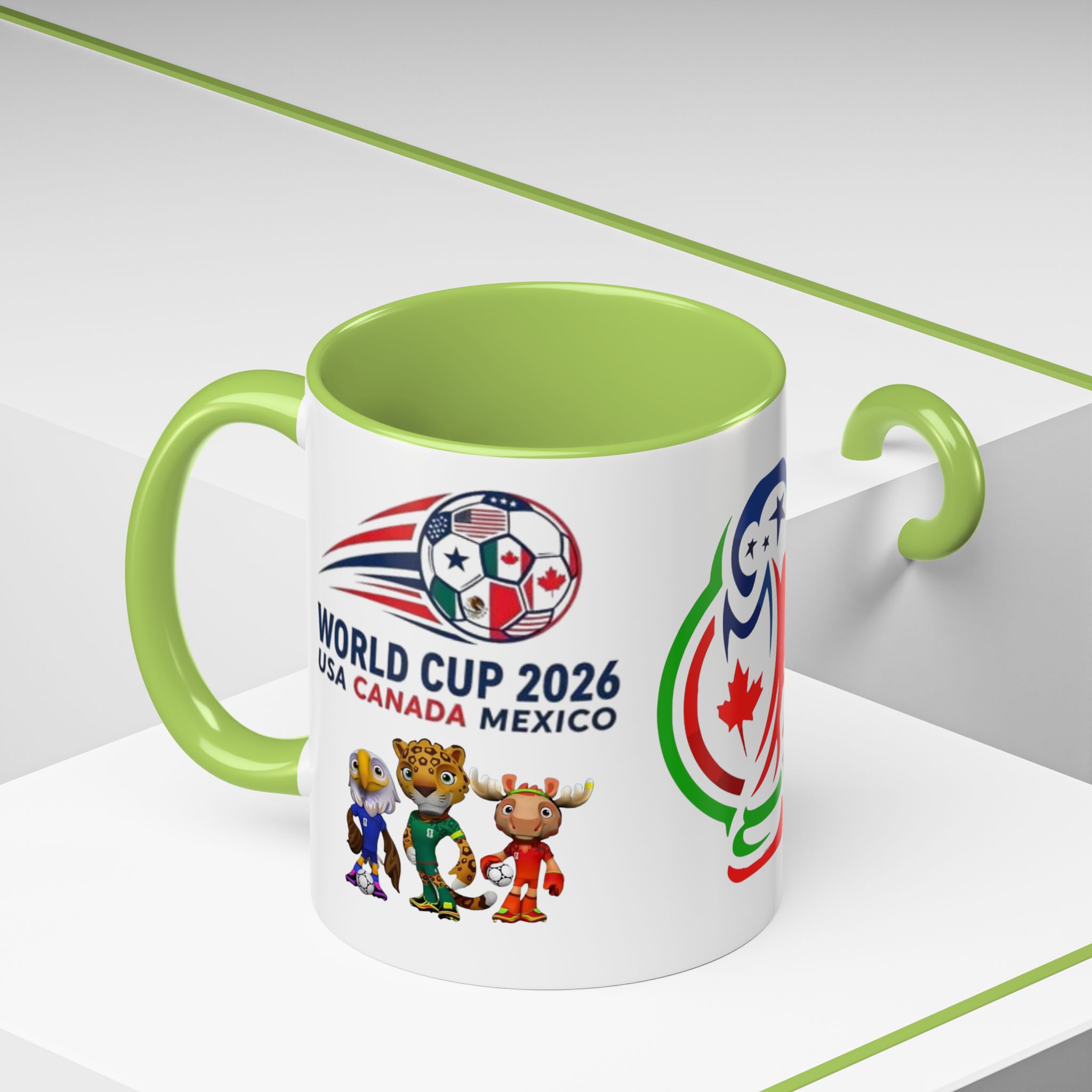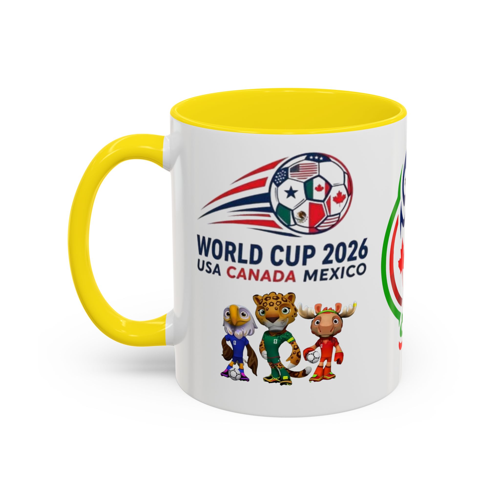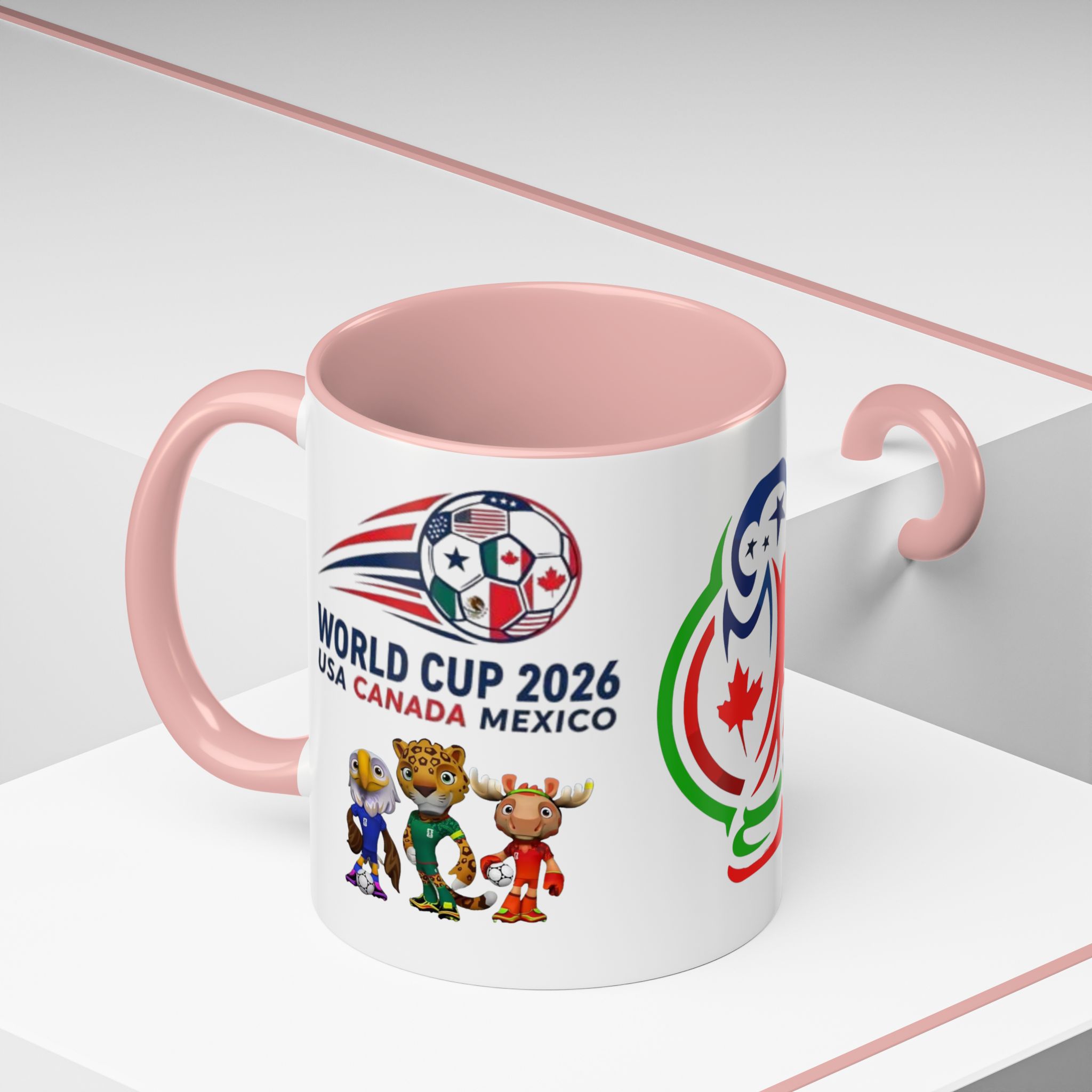 Feel the excitement of kickoff every morning with this colorful soccer-themed mug. The glossy white ceramic contrasts with a bold black interior and handle, wrapping your favorite brew in vibrant World Cup 2026 motifs. Imagery from USA, Canada, and Mexico circles the cup—mini mascots and a stylized trophy bring playful energy to your routine. It sits comfortably in hand with a C-shaped handle and gives off a stadium-bright vibe at home, the office, or while watching matches with friends. Durable, bright prints hold up through daily use so the colors stay lively as you cheer on the teams.